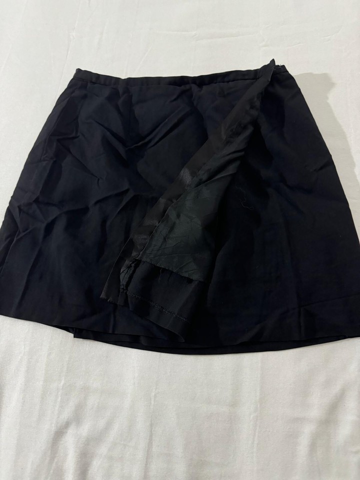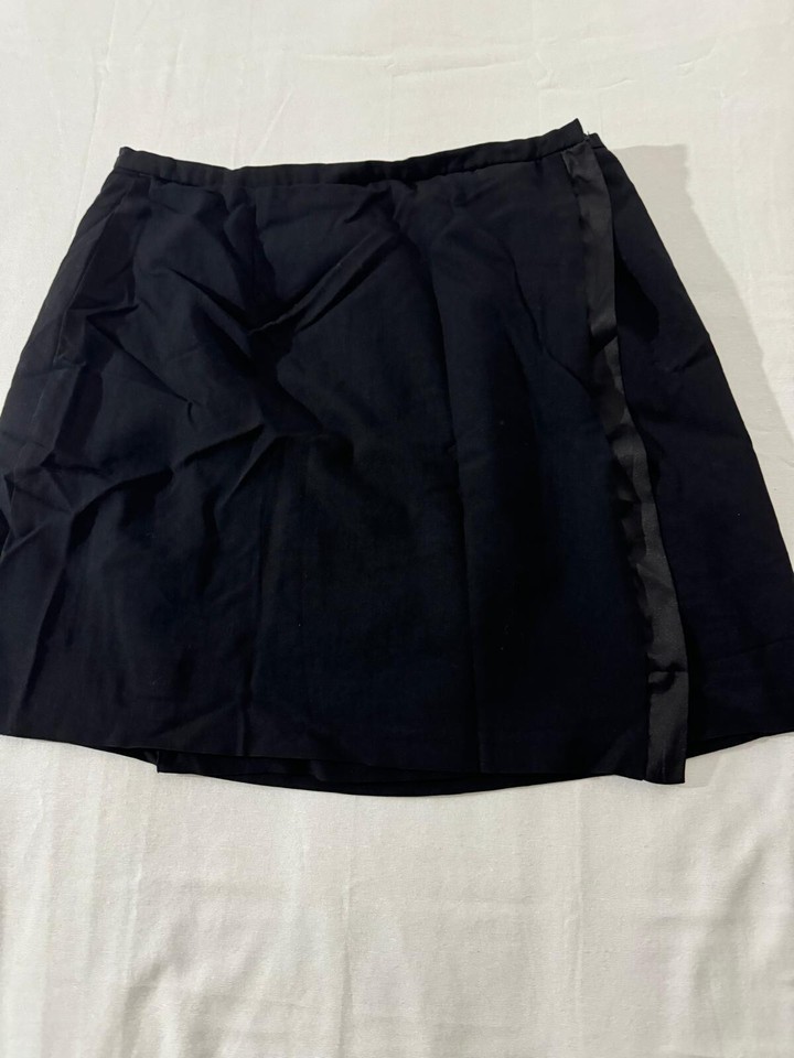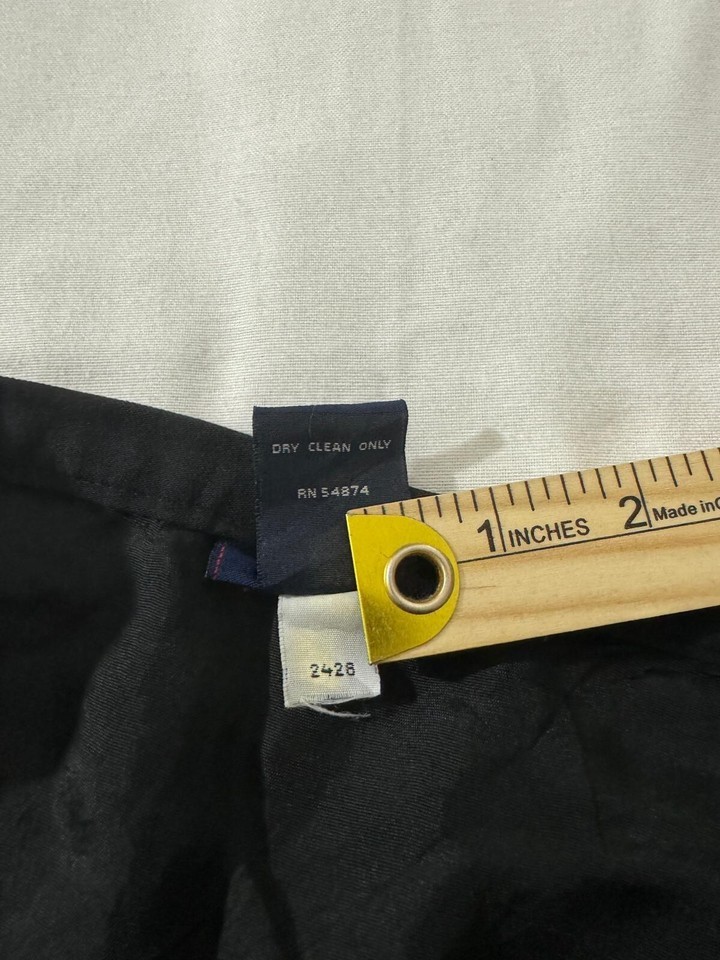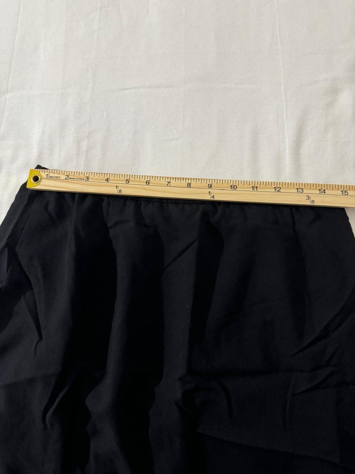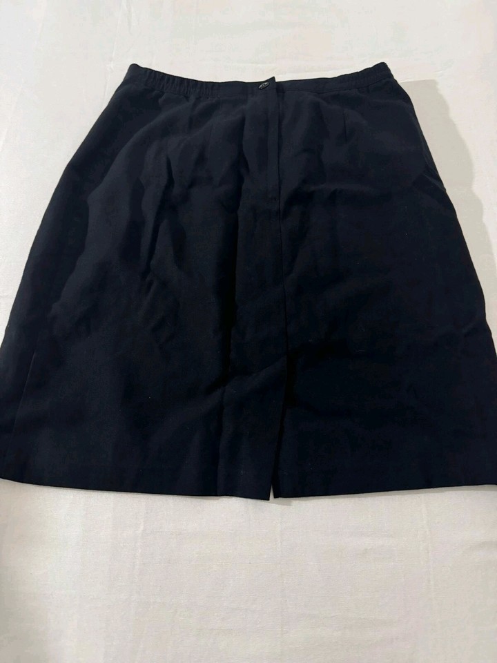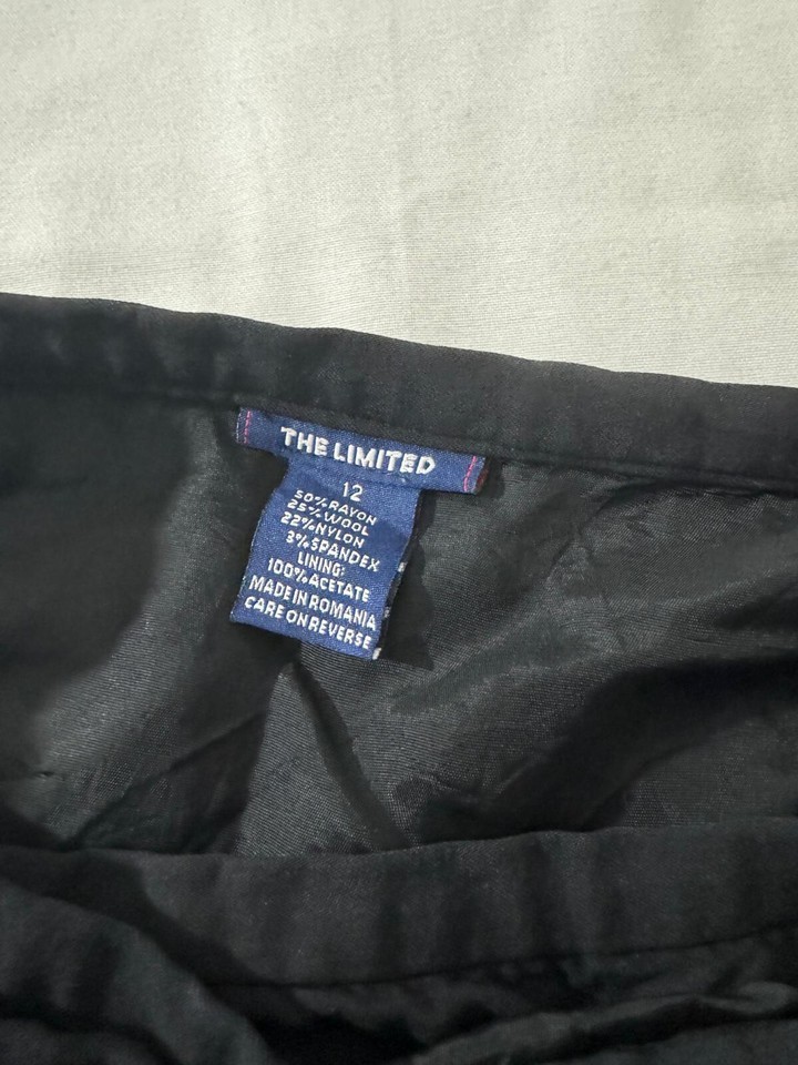 This is a versatile and stylish black pencil skirt from The Limited in size 12, with a pull-on design and a faux wrap detail for added flair. The skirt is made of a blend of polyester, spandex, nylon, and wool, featuring a solid pattern with a mid-rise waist and a 17-inch length. It can be worn for various occasions such as travel, weddings, parties, or work, making it a practical and chic addition to any woman's wardrobe.
