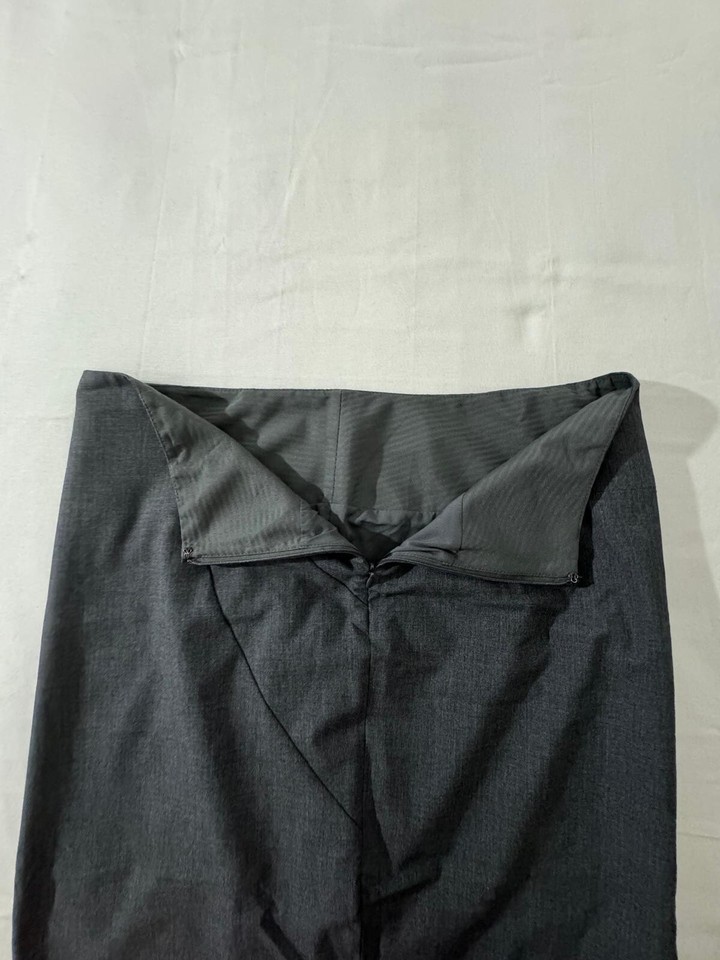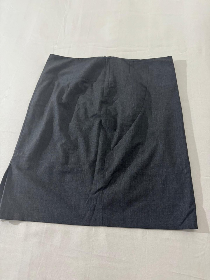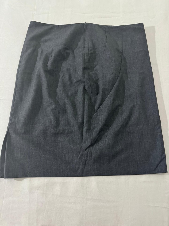 This is a stylish A-line skirt from The Limited in size 12, featuring a solid gray color and a rear zip closure with a side slit. The skirt is made of a blend of polyester, spandex, and viscose, with a polyester fabric type and a mid-rise fit. It is designed with zipper accents and is lined for added comfort. This pull-on skirt has a length of 22 inches, offering a chic and versatile addition to any woman's wardrobe.