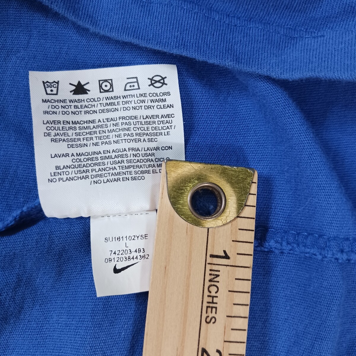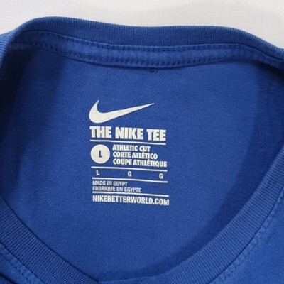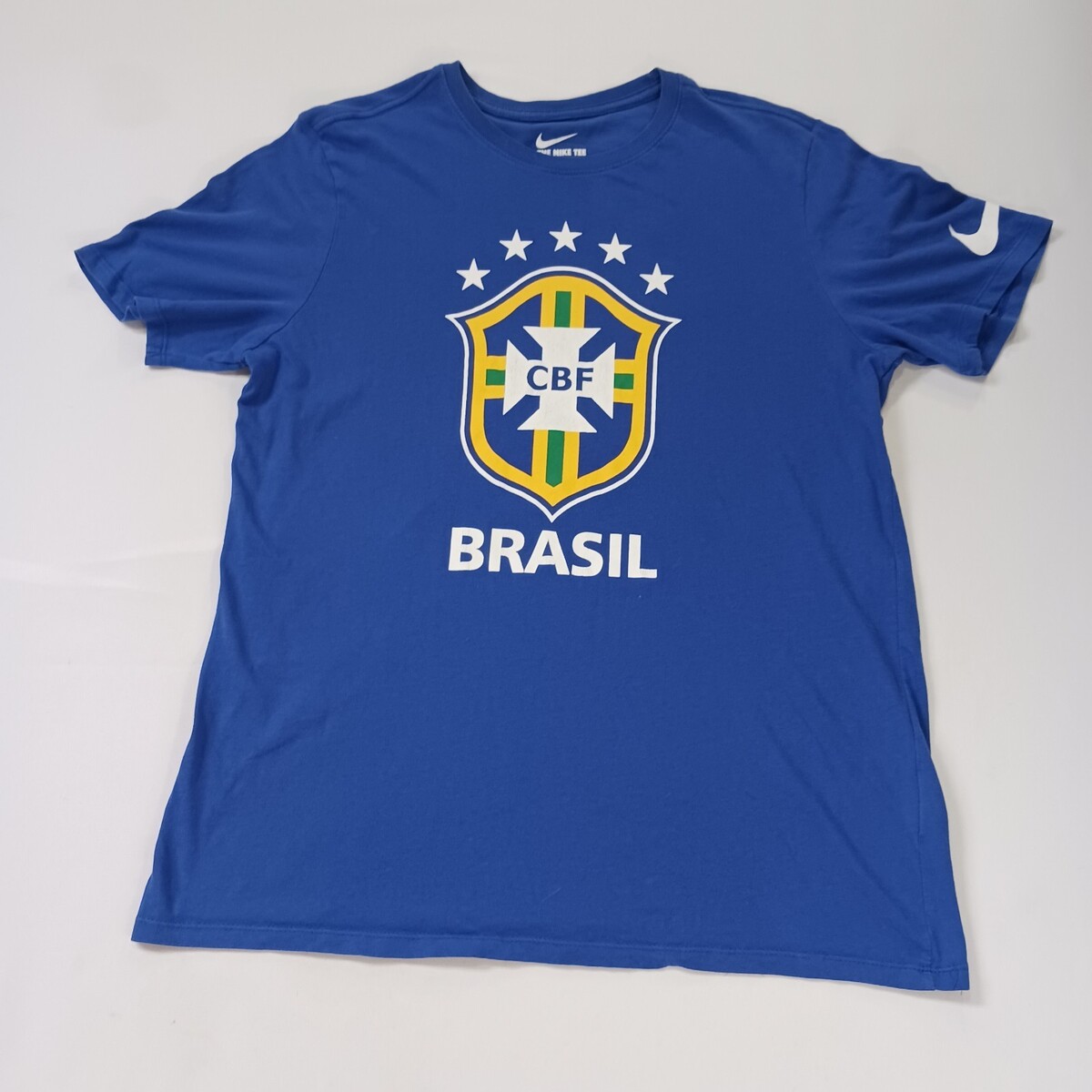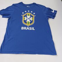 The Nike Tee CBF Brazil Futbol Soccer Team Youth Blue Cotton T-Shirt in size large is an officially licensed shirt for young fans of the Brazil national soccer team. Made by Nike, this shirt in vibrant blue color is perfect for showing support for the Brazilian team. Whether worn by boys or girls, this unisex children's shirt from Brazil is a must-have for any young soccer enthusiast looking to cheer on their favorite team.