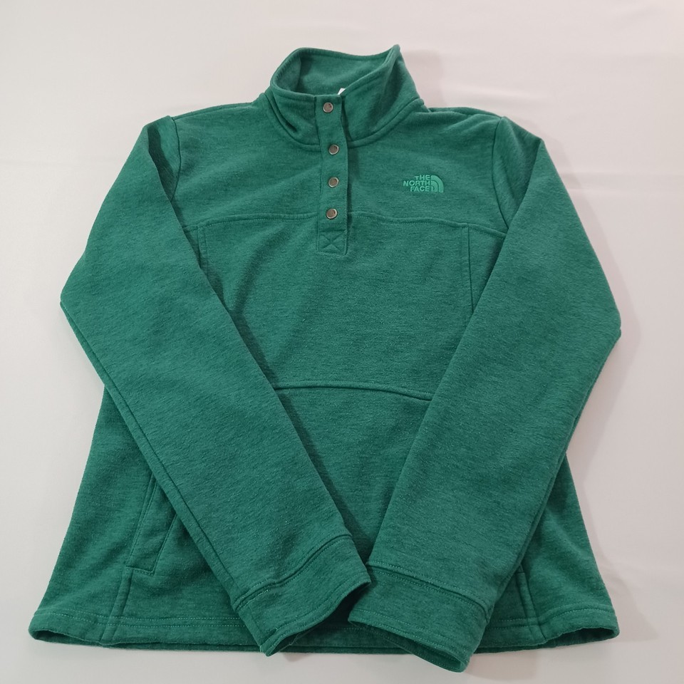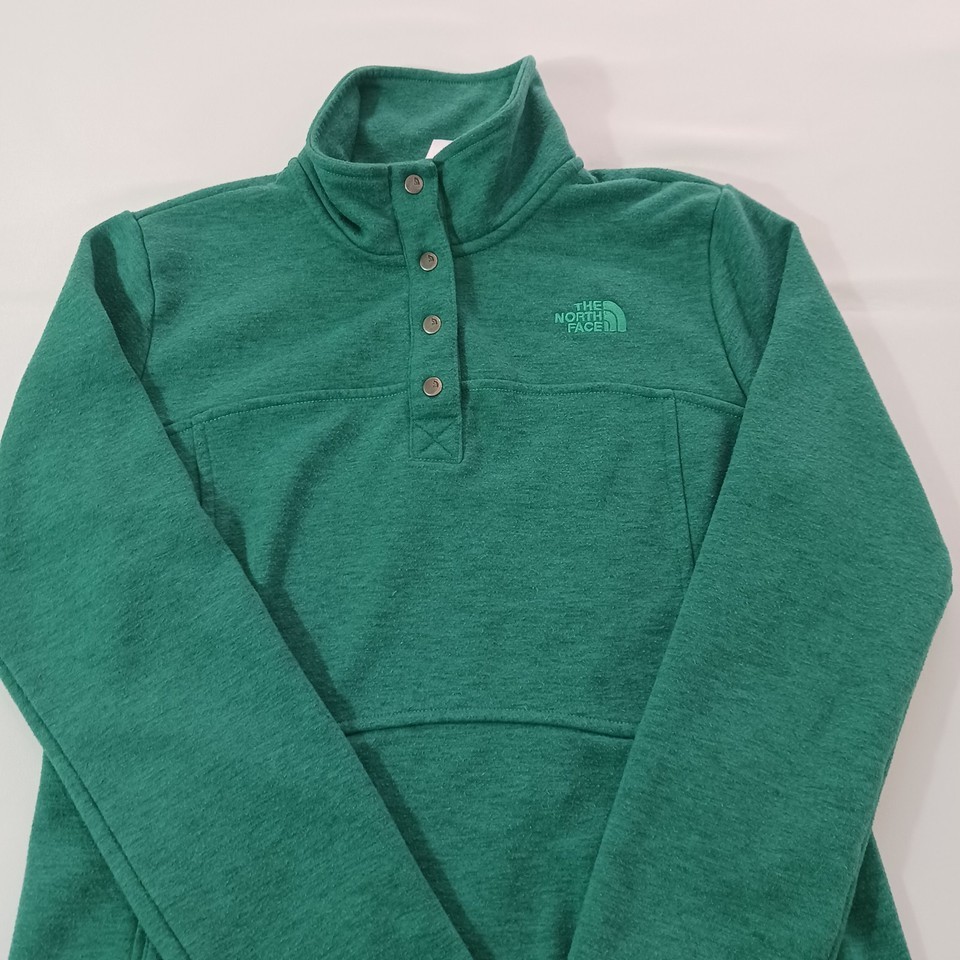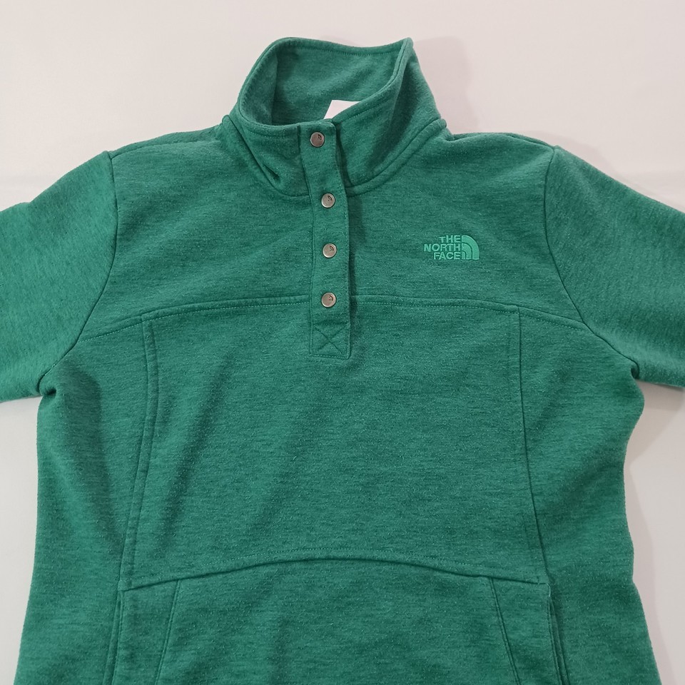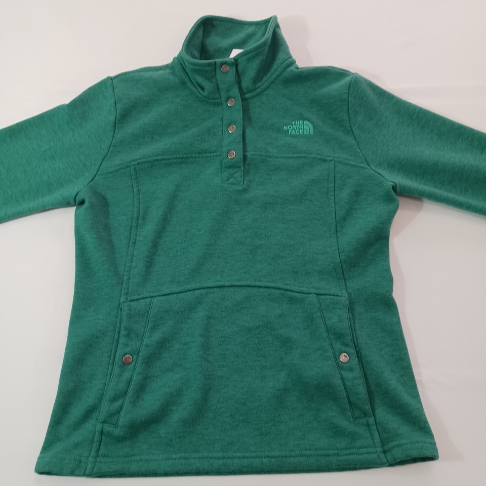 Elevate your activewear collection with this stylish green pullover sweatshirt from The North Face. Designed with a solid pattern and long sleeves, this fleece sweatshirt features a 1/4 snap closure for easy wear. The chest size is 36 inches, and it comes in a regular size type for women.