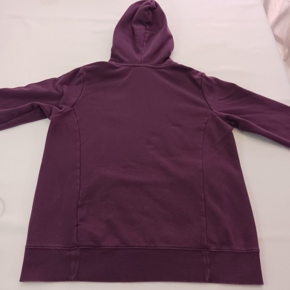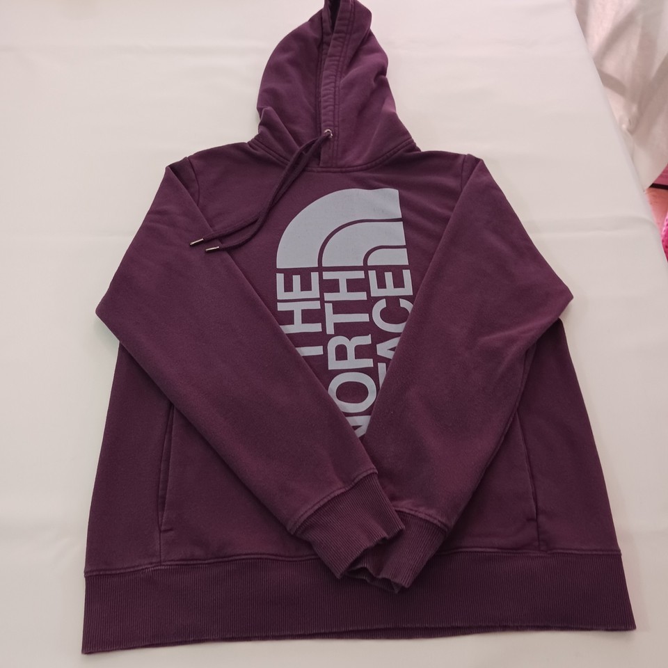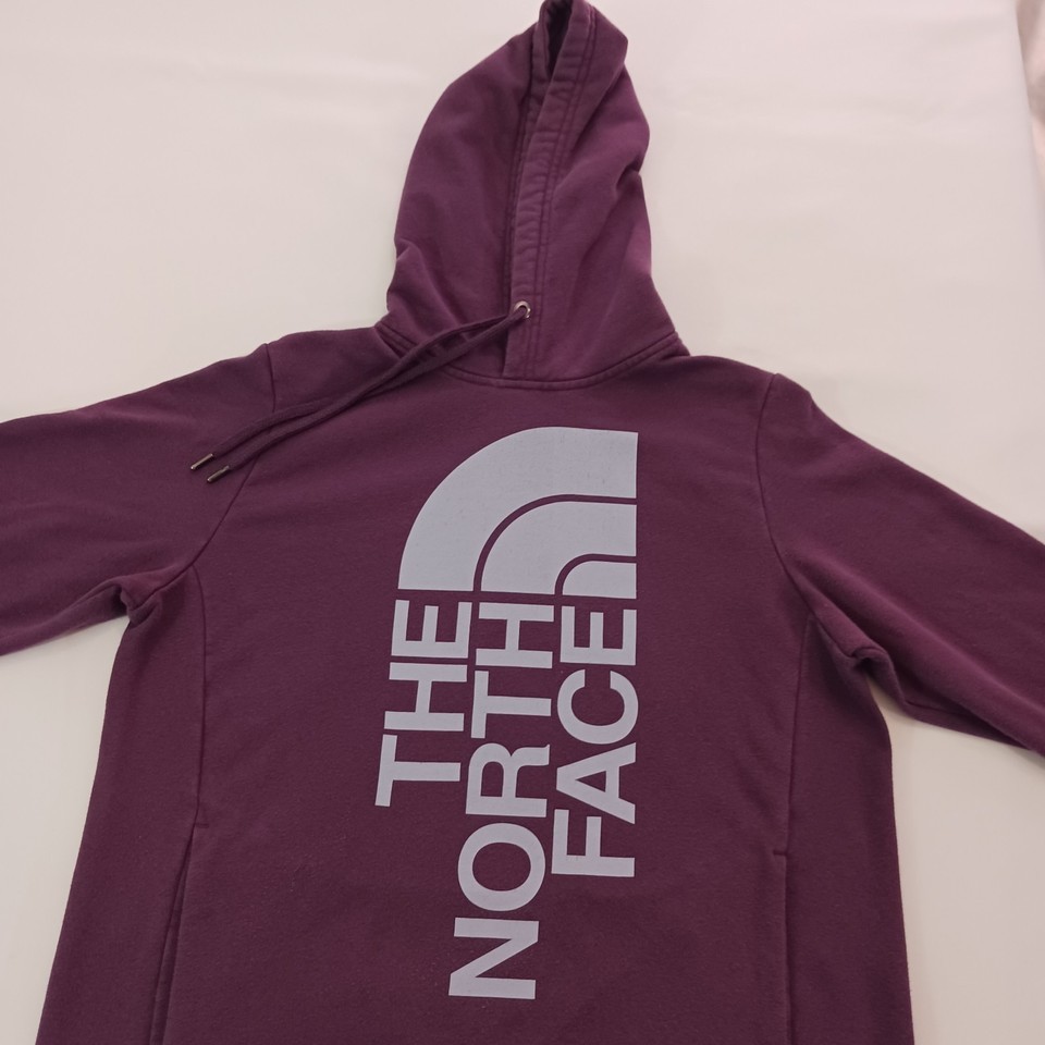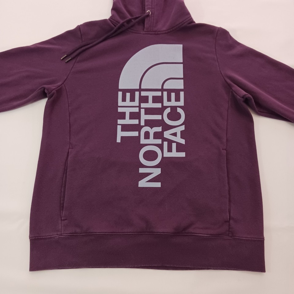 The North Face NF0A471T Women's Purple Trivert Pullover Hoodie Sweatshirt in size M is a stylish and functional piece of activewear for women. Made from a blended fabric of polyester and cotton, the hoodie features a high neckline with a drawstring closure for a customized fit. It has a hood, pockets, and breathable material, making it perfect for outdoor activities in the winter, fall, or spring seasons. The solid purple color and logo accents add a fashionable touch, while the raglan sleeves provide a comfortable fit. Ideal for walking or hiking, this hoodie is a versatile and practical addition to any wardrobe.