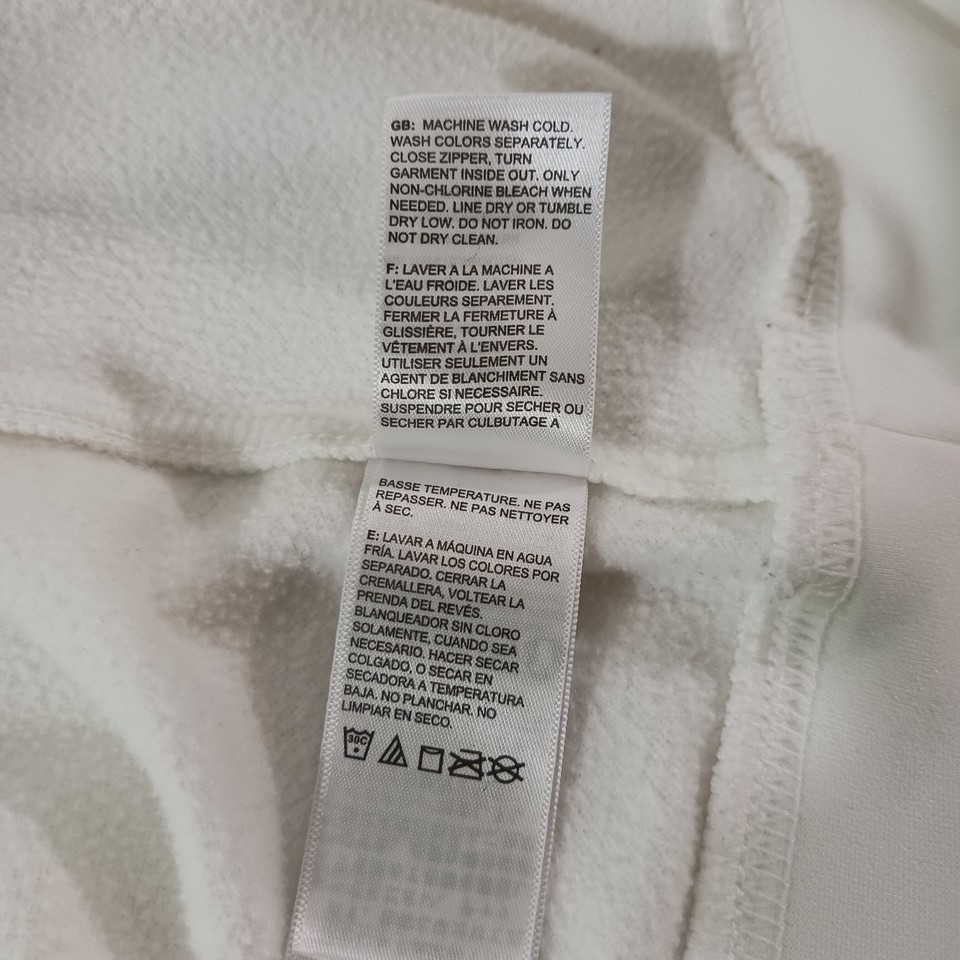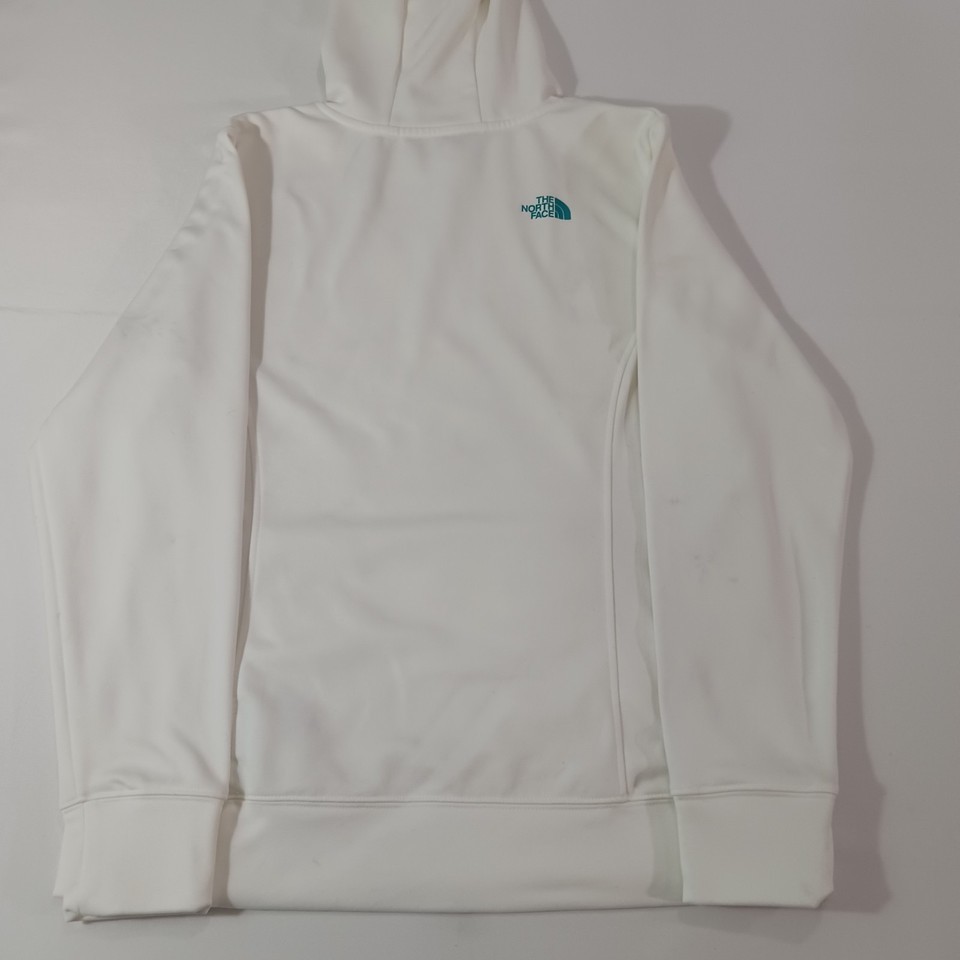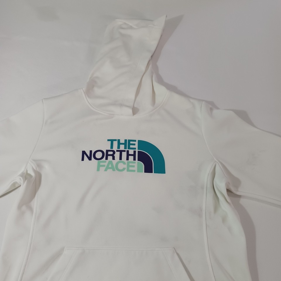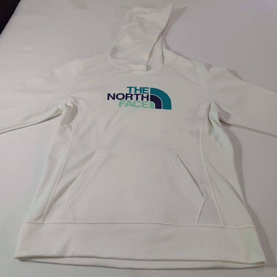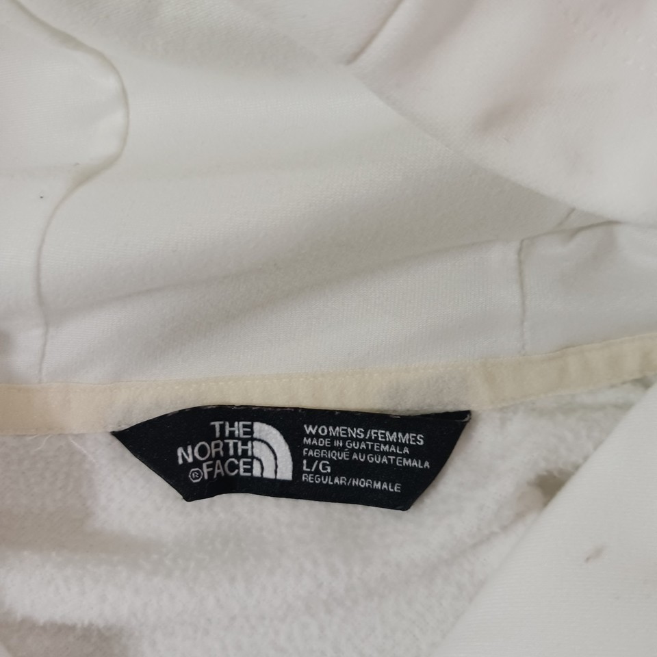 This hoodie has a classic logo theme and is not vintage. It is machine washable and comes in size large. The North Face Women's White Hoodie is ideal for walking, beach, school, skiing, cross training, fishing, hiking, cheerleading, running, and jogging.
