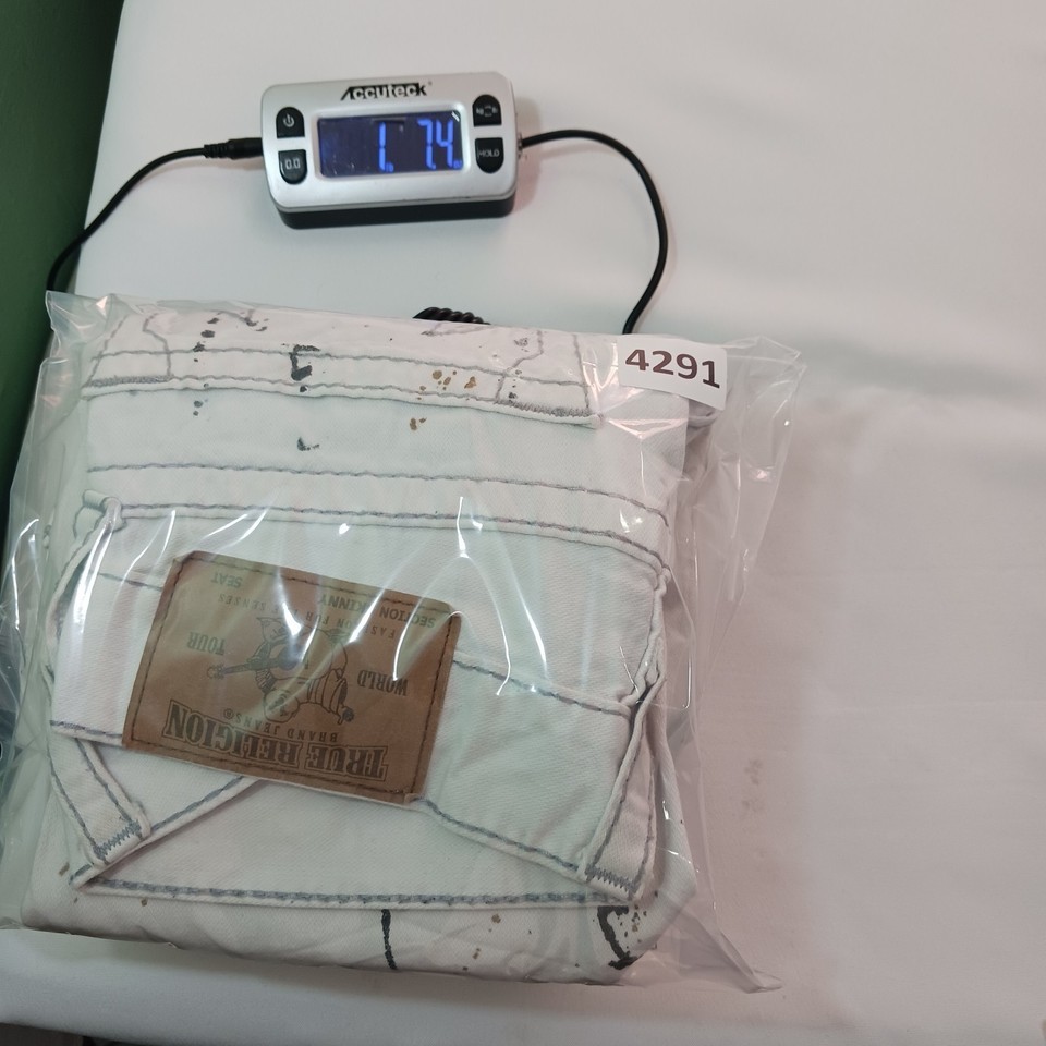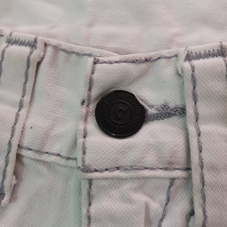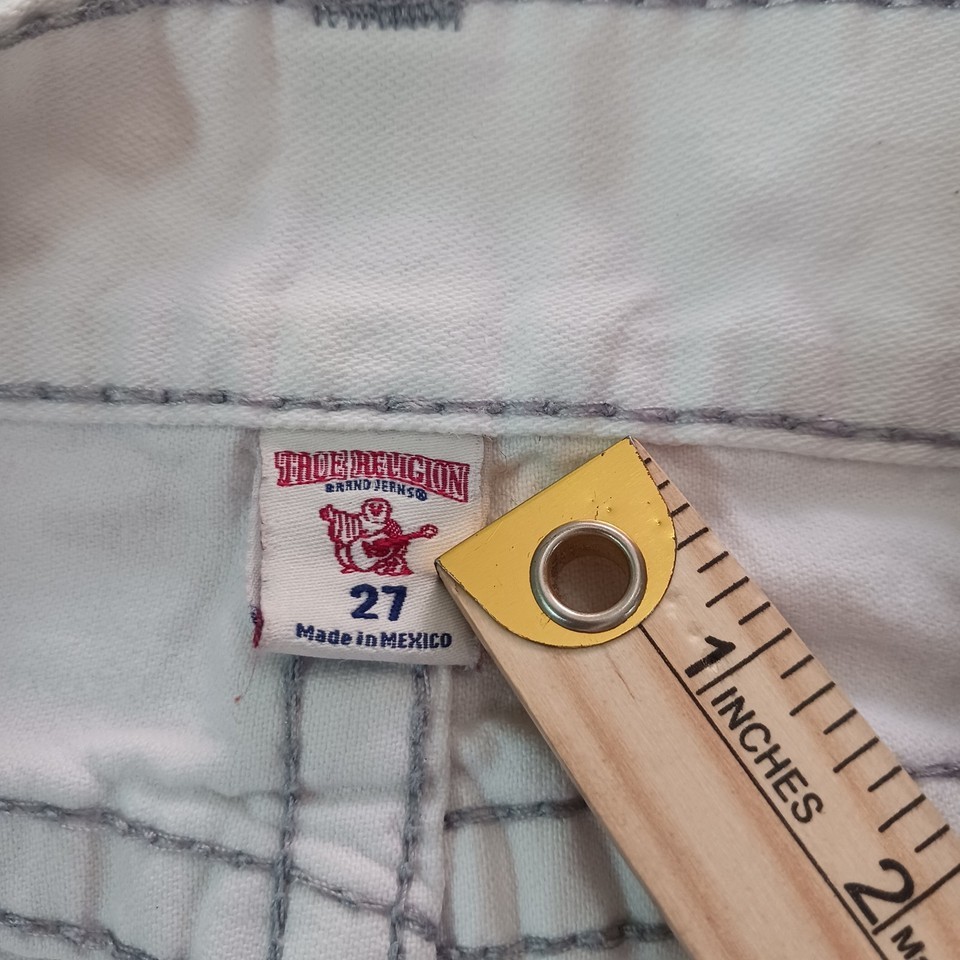 This product is a pair of white cotton skinny jeans for women, made by True Religion. They have a paint design and a 5-pocket design. The jeans have a zip and button closure and are size 27. The waist size is 28 inches and the inseam is 33 inches. The product is made in Mexico and has a solid pattern.