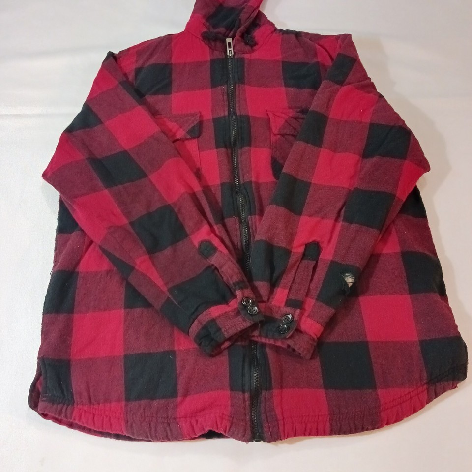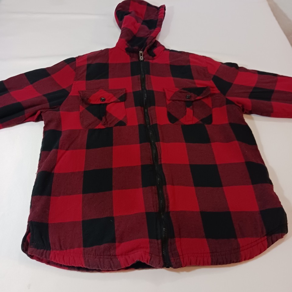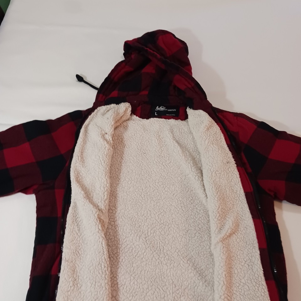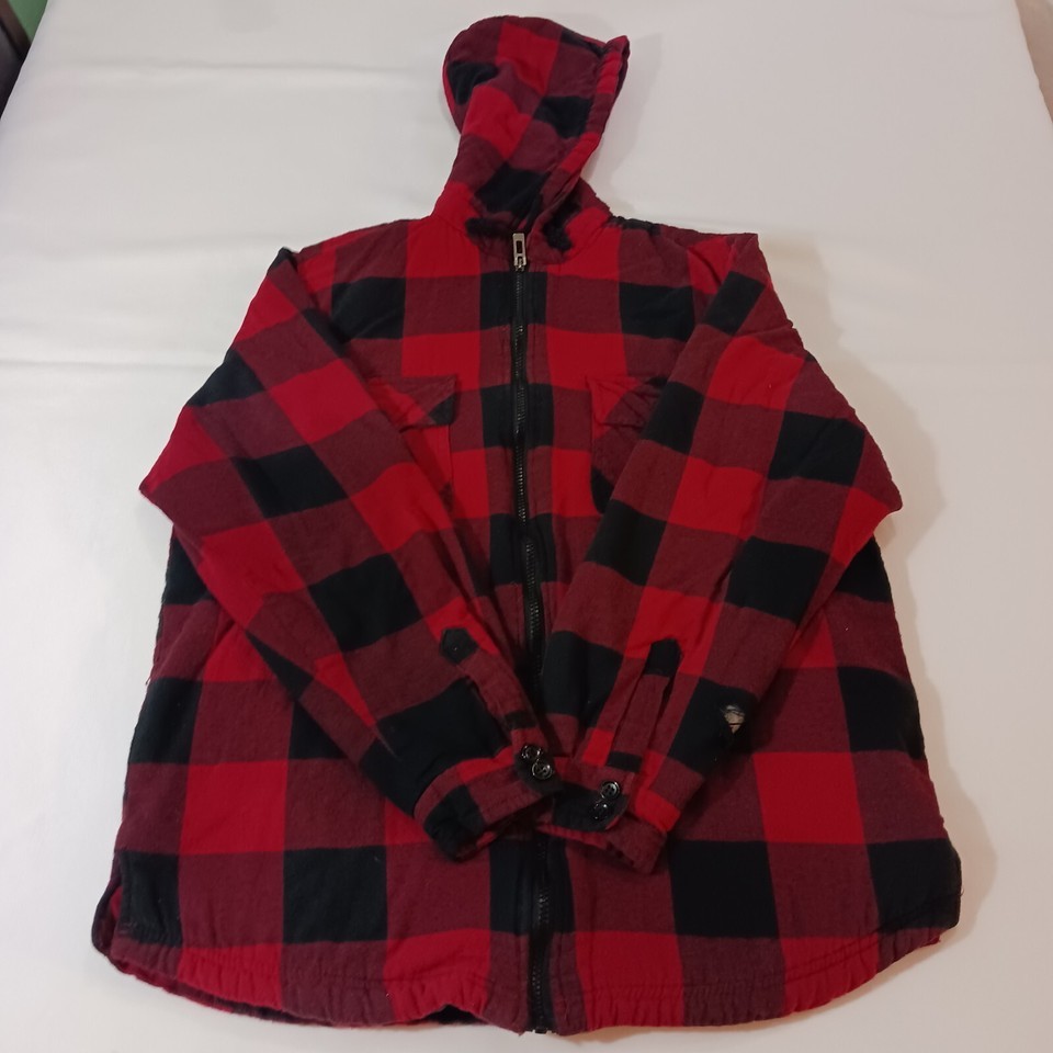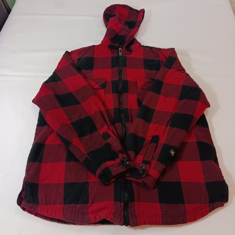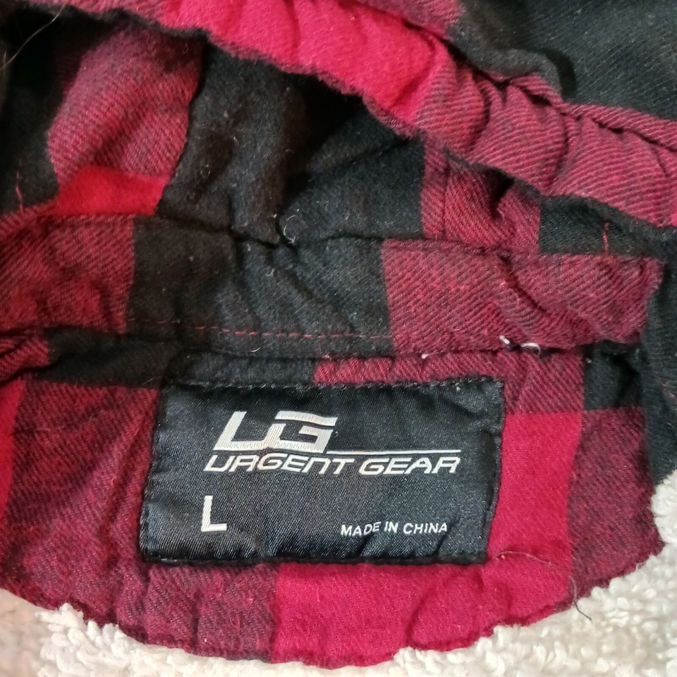 This UG Urgent Gear men's jacket is a stylish choice for chilly weather. The outer shell material is polyester with a red and black flannel pattern, featuring a full zip closure and a hood for added warmth. The jacket is a size large with a chest size of 45 inches and has a cotton blend lining for comfort. This versatile jacket is designed in a regular fit and is perfect for men who appreciate both style and functionality.