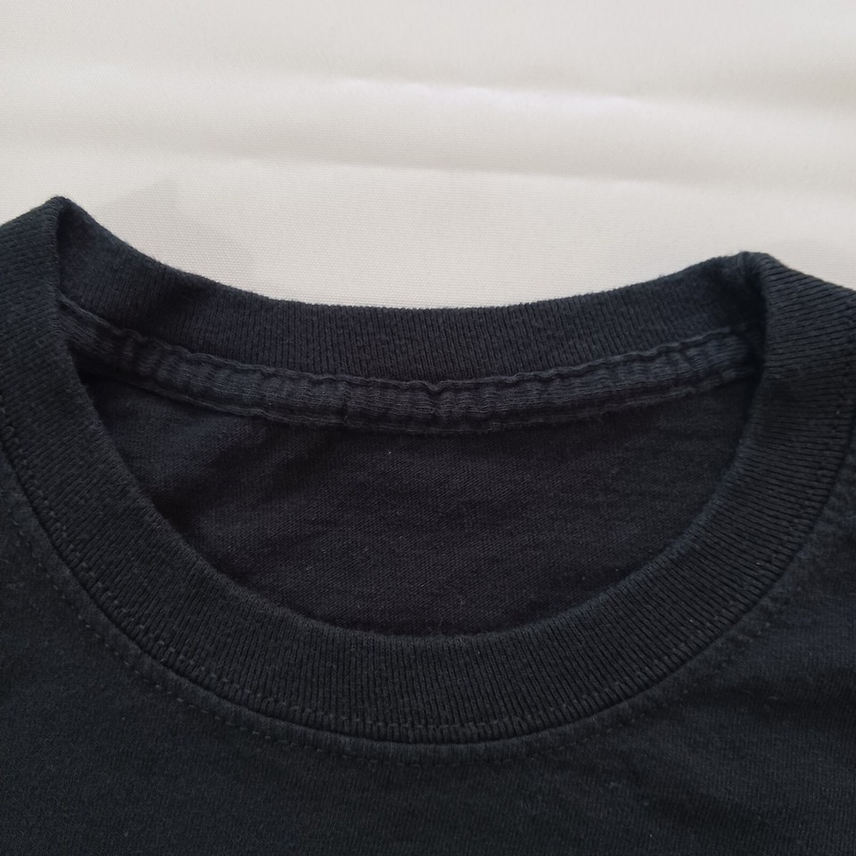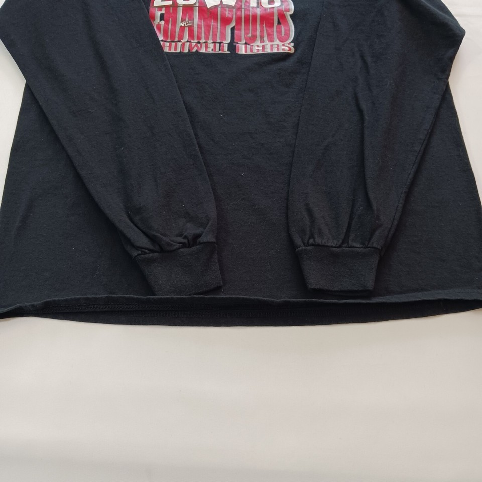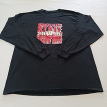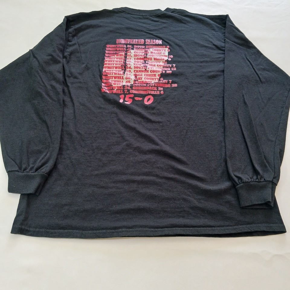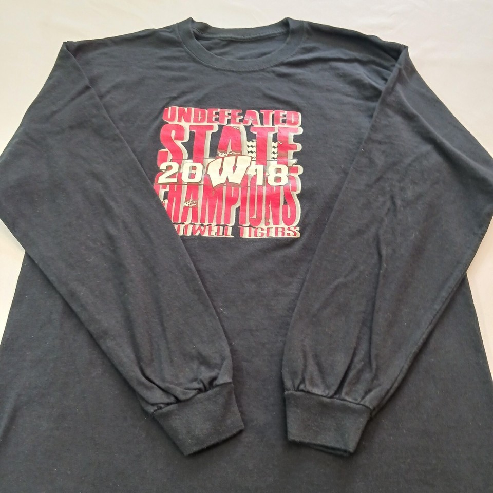 This is a pre-owned men's black T-shirt with a crew neck and long sleeves. The shirt features a graphic design with the words "Undefeated State 2018 Champions Whitwell Tigers" and various sports and logo themes. It is made of cotton and is machine washable. The shirt is a regular fit and is a size medium.