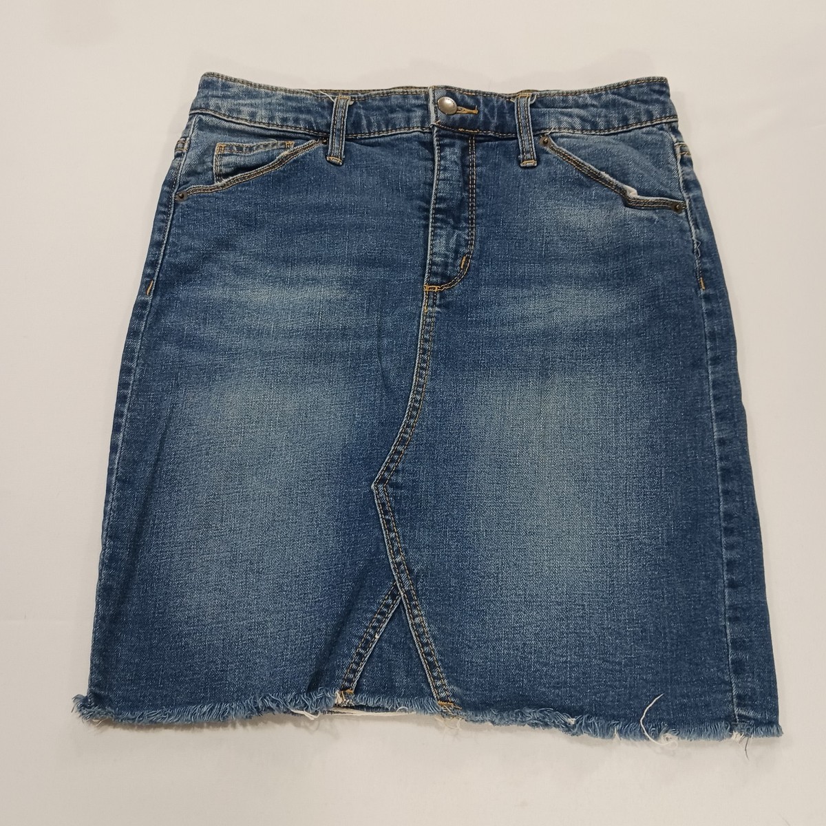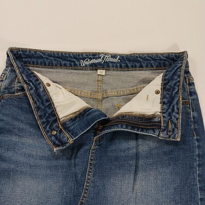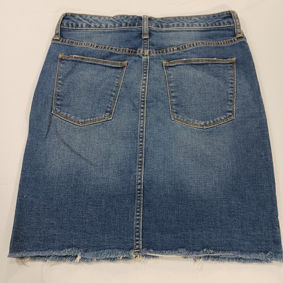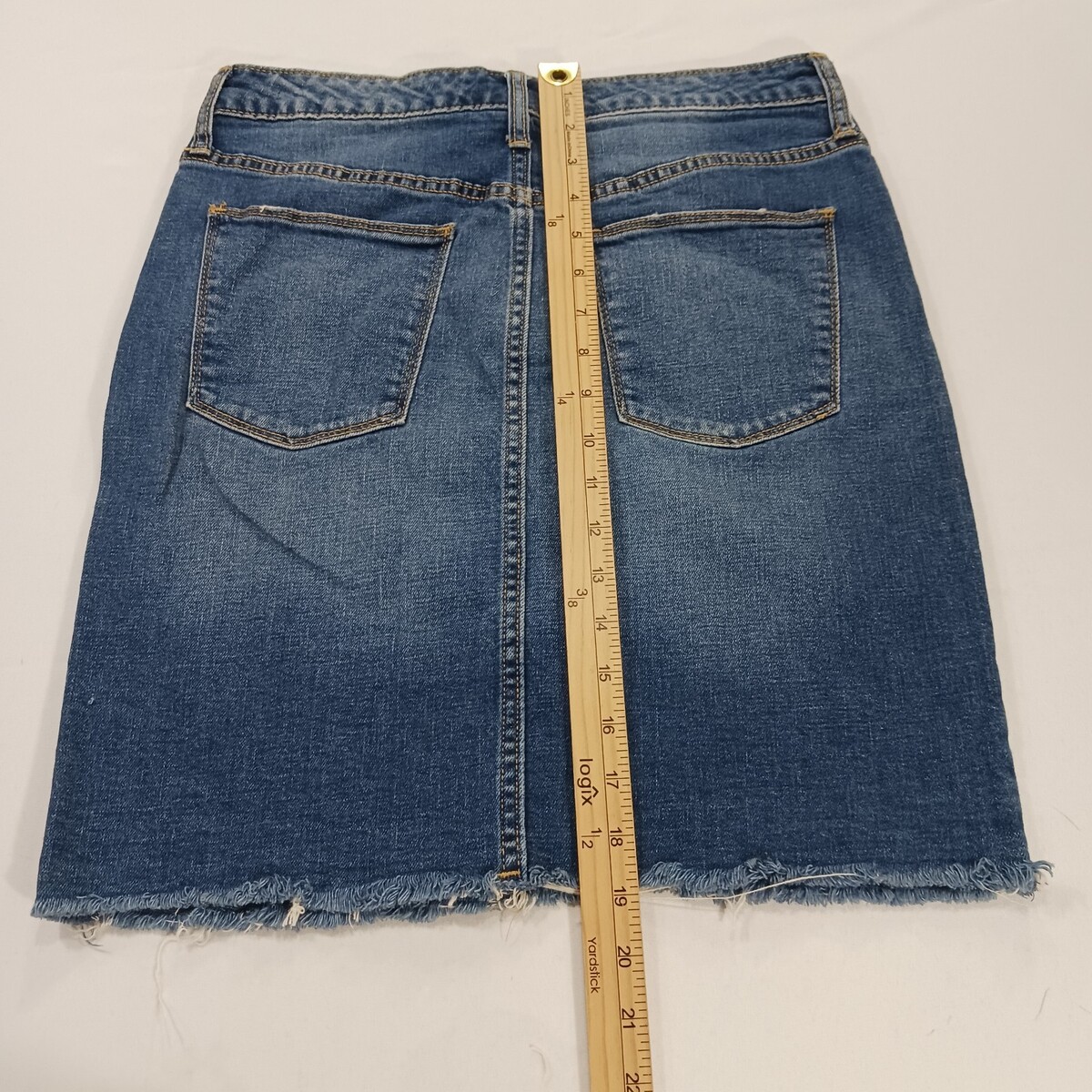 The Universal Thread Women's Blue Frayed Denim Cotton Blend Skirt in size 10/30 is a stylish and versatile addition to any woman's wardrobe. Made from a comfortable cotton blend fabric with a touch of spandex for added stretch, this mini skirt features a solid blue color and a zip closure for easy wear. The frayed detailing adds a trendy and edgy touch to this classic piece, perfect for pairing with your favorite top and shoes for a casual yet chic look. Made in China by Universal Thread, this skirt is designed for a regular fit and measures 19 inches in length.