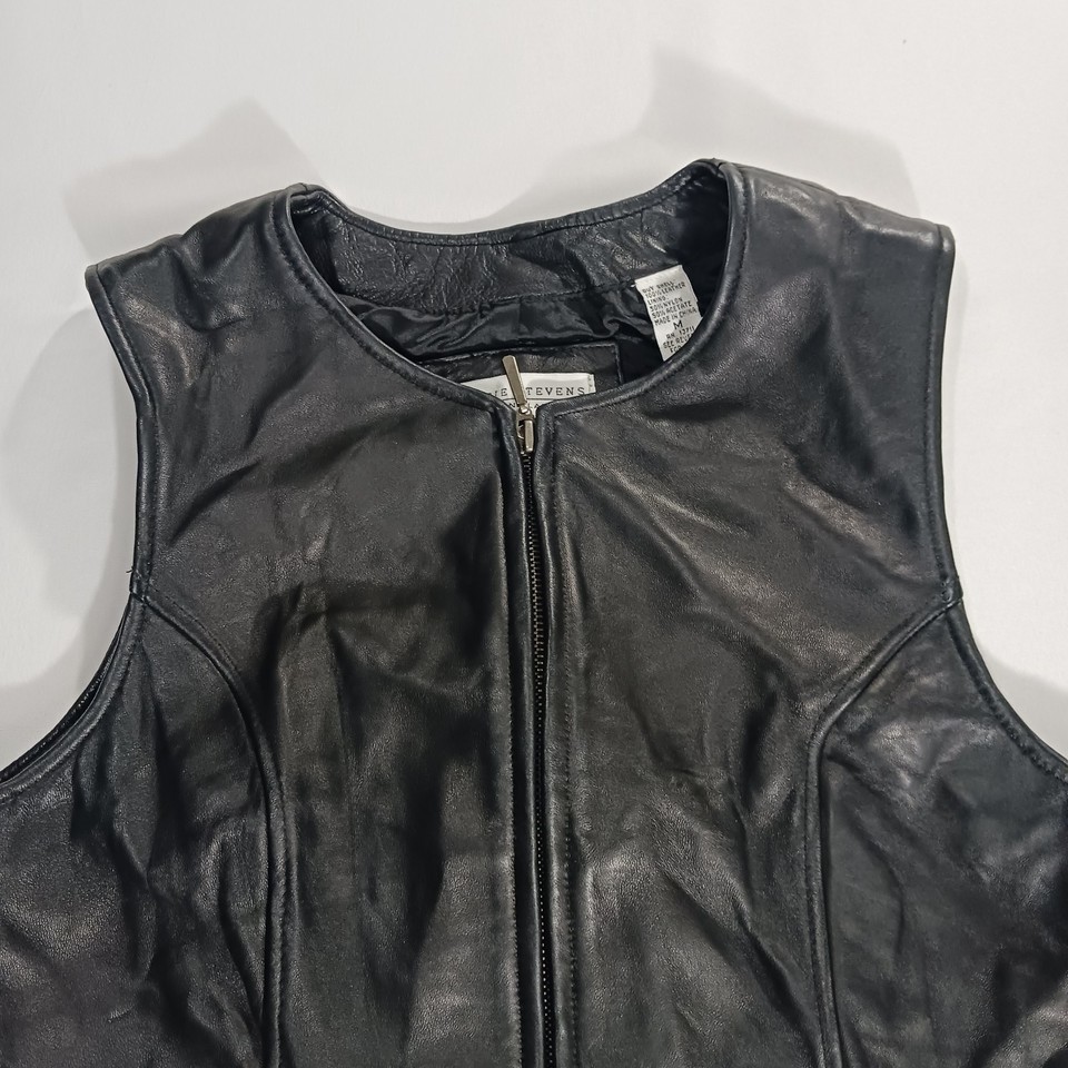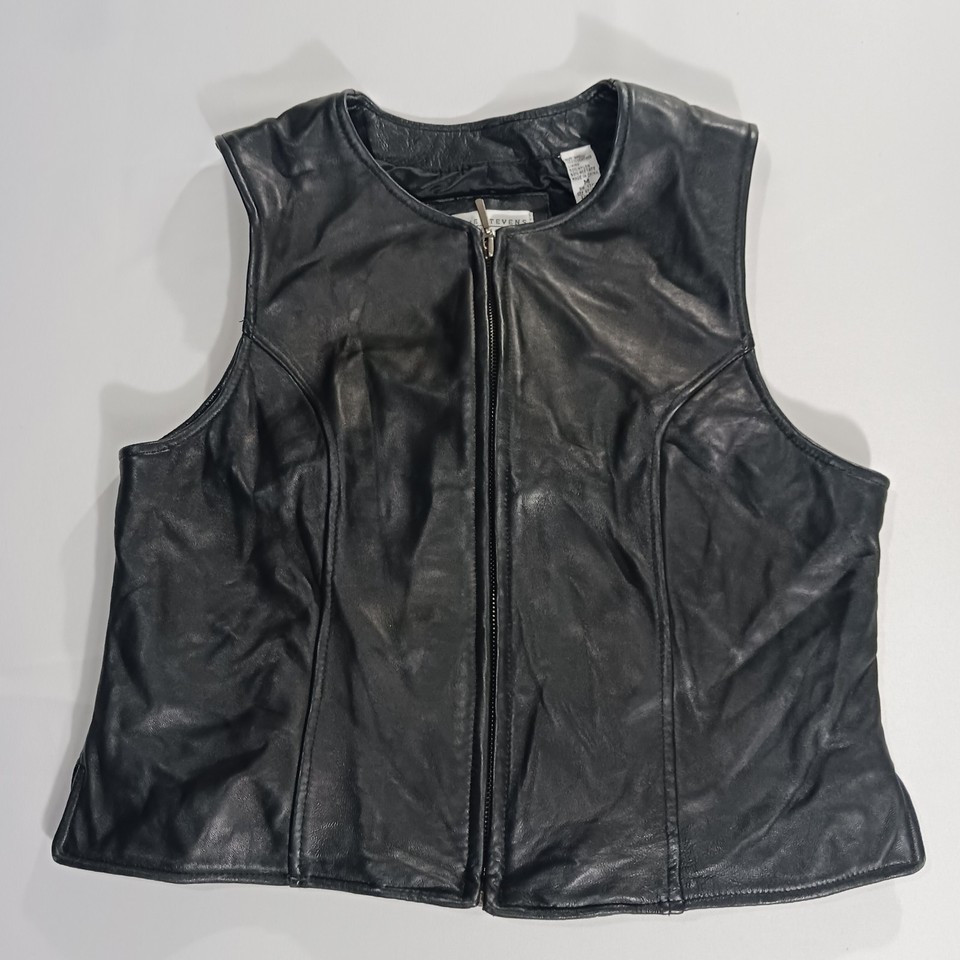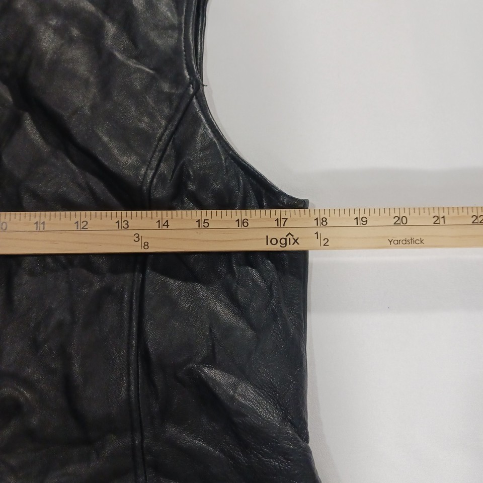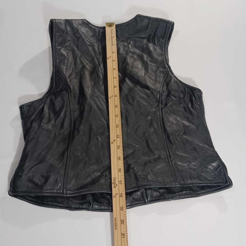 The Valerie Stevens New Zealand Lambskin Women's Black Leather Vest in size M is a stylish and versatile outerwear piece perfect for casual occasions. Made from high-quality leather with a solid black color and zip closure, this sleeveless vest has a biker theme and a regular fit. The 19-inch length and basic jacket style make it a classic addition to any winter, fall, or spring wardrobe. Designed by the reputable brand Valerie Stevens, this leather vest is a timeless and fashionable choice for women looking to add a touch of sophistication to their look.