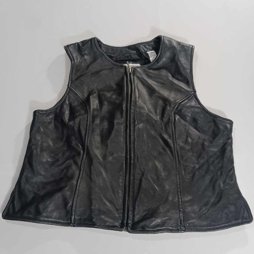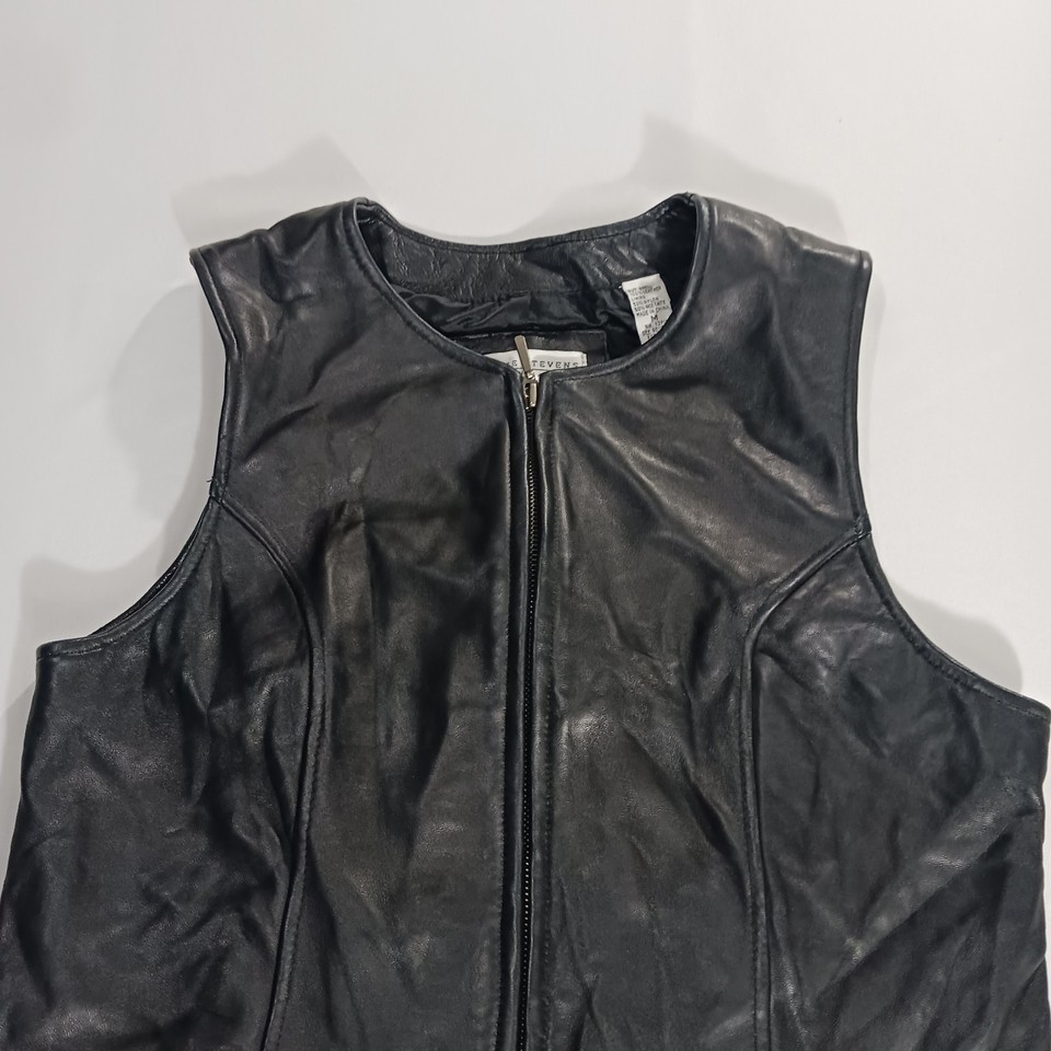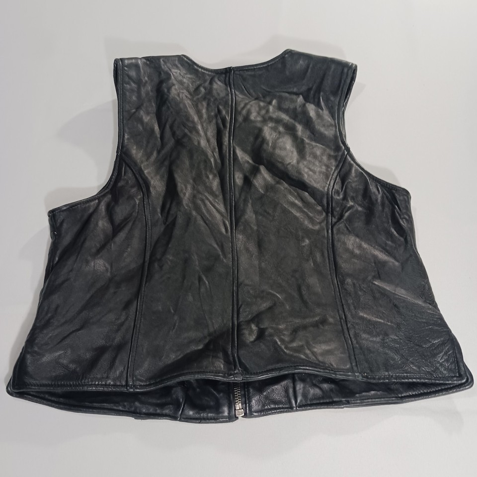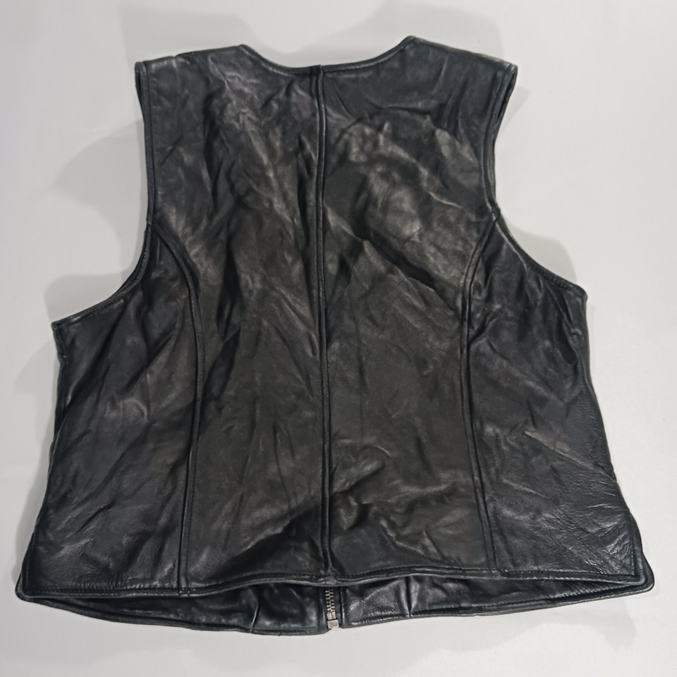 The Valerie Stevens New Zealand Lambskin Women's Black Leather Vest in size M is a stylish and versatile outerwear piece perfect for casual occasions. Made from high-quality leather with a solid black color and zip closure, this sleeveless vest has a biker theme and a regular fit. The 19-inch length and basic jacket style make it a classic addition to any winter, fall, or spring wardrobe. Designed by the reputable brand Valerie Stevens, this leather vest is a timeless and fashionable choice for women looking to add a touch of sophistication to their look.