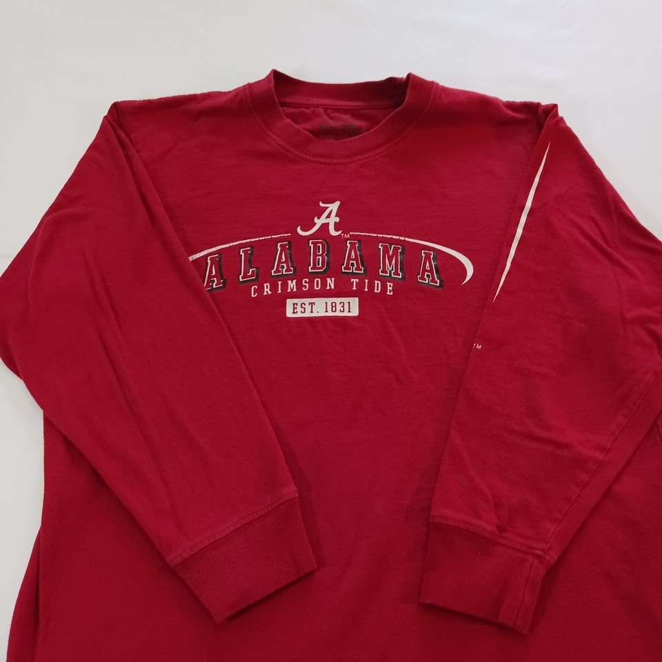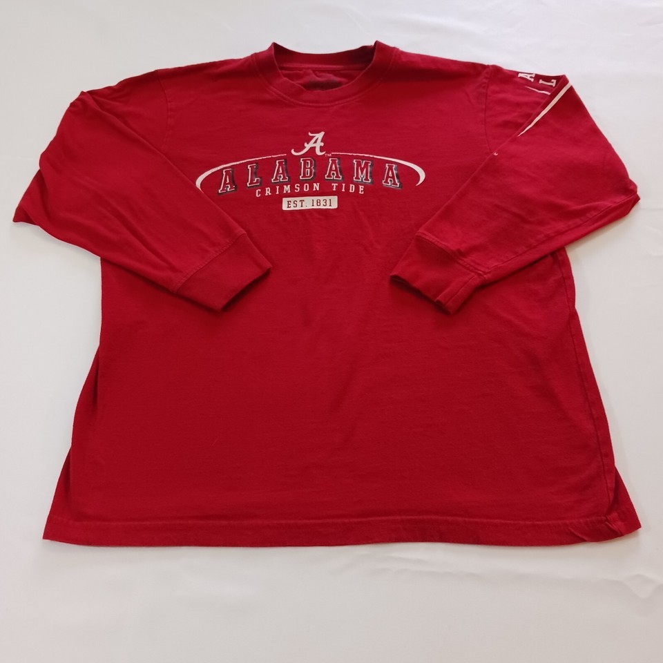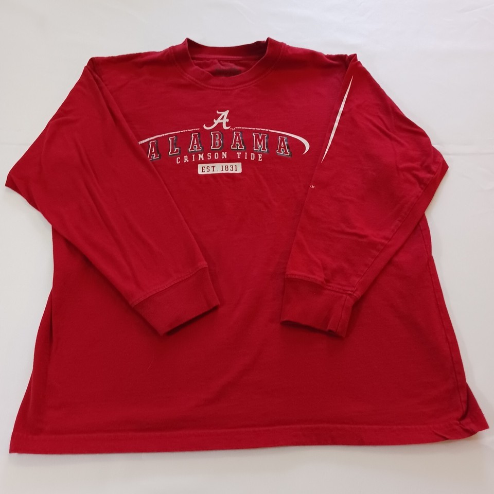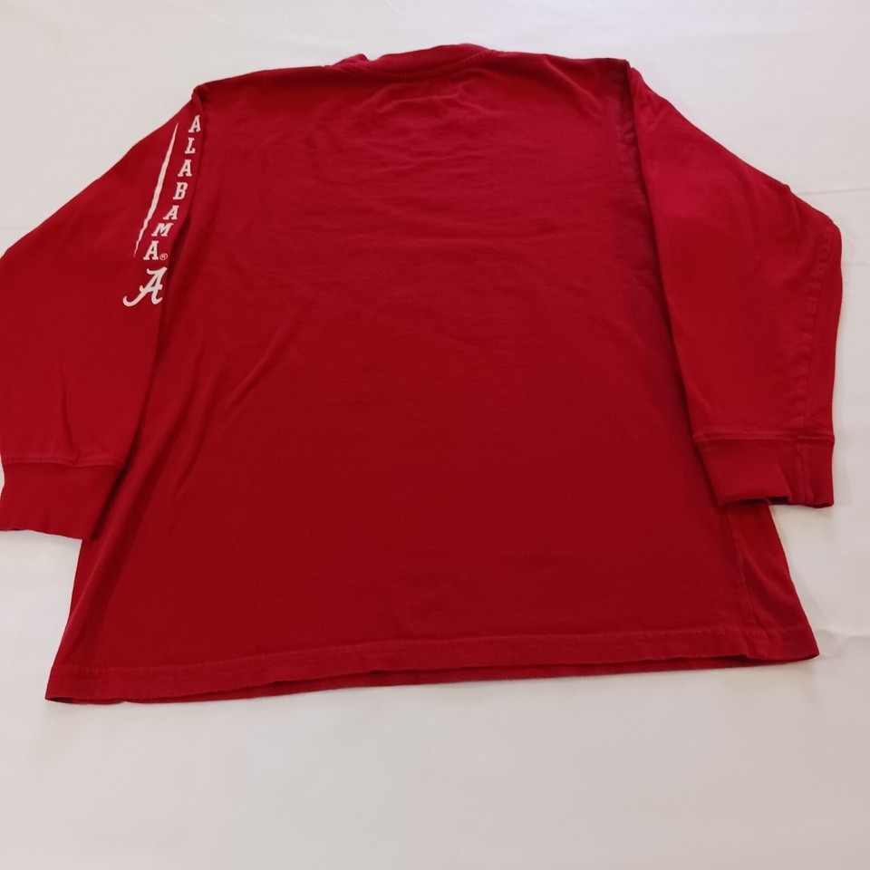This is a red long sleeve shirt for youth men who support the Alabama Crimson Tide football team. The shirt is made by Varsity Classics and is in used condition. The size is YXL.