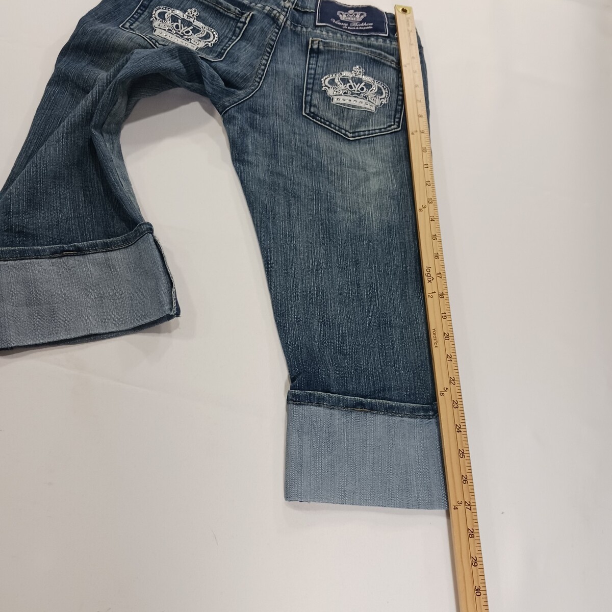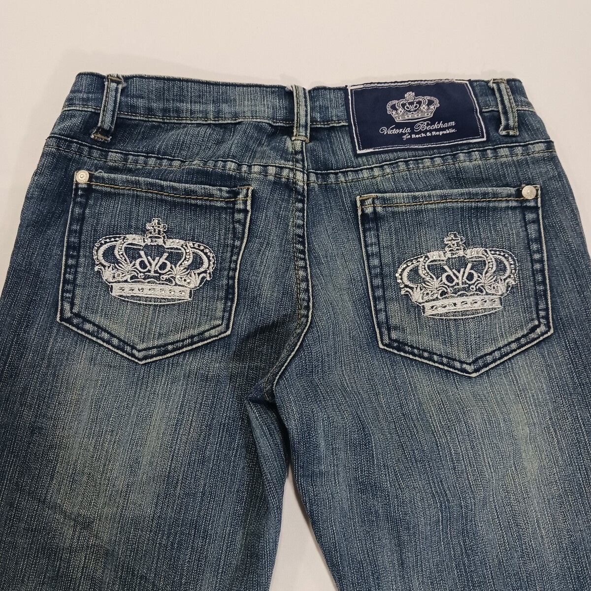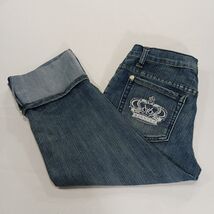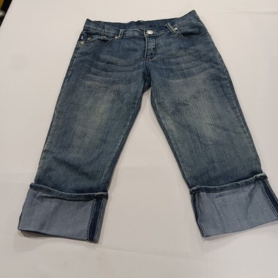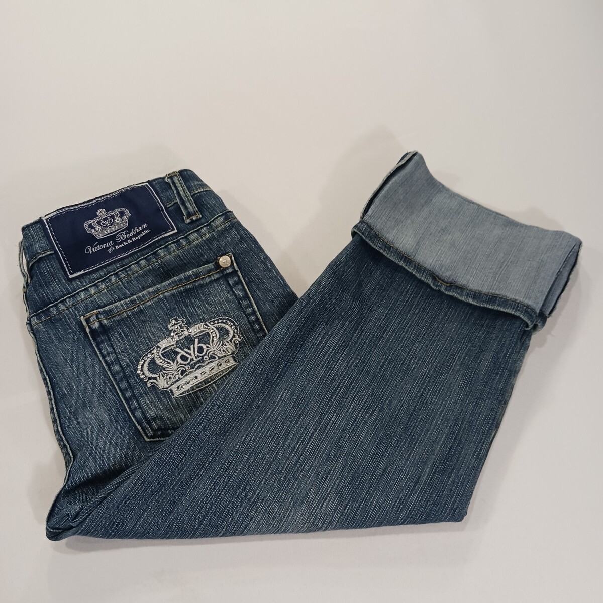 The Victoria Beckham Rock & Republic Women's Blue Denim Cropped Jeans in Size 28 are a stylish and versatile addition to any wardrobe. Made from comfortable cotton denim with a solid blue color and medium wash, these jeans feature a zip and button closure, embroidered logo accents, and a 5-pocket design. The regular fit and cropped style make them perfect for any season, while the machine washable fabric ensures easy care. Celebrate your personal style with these designer jeans that combine fashion and comfort effortlessly.