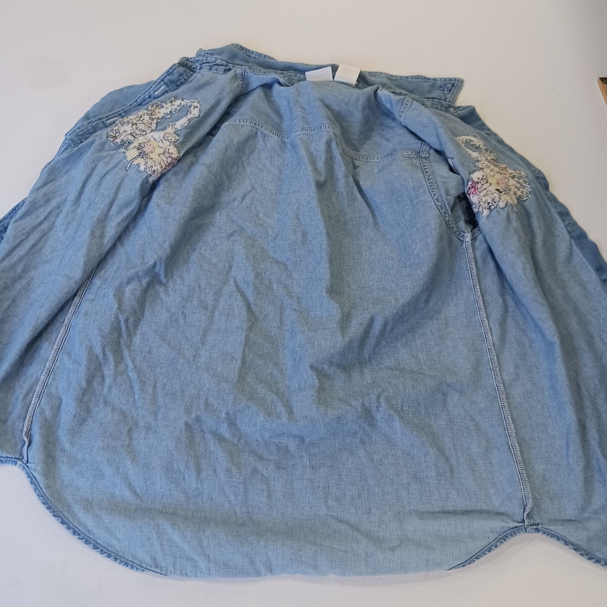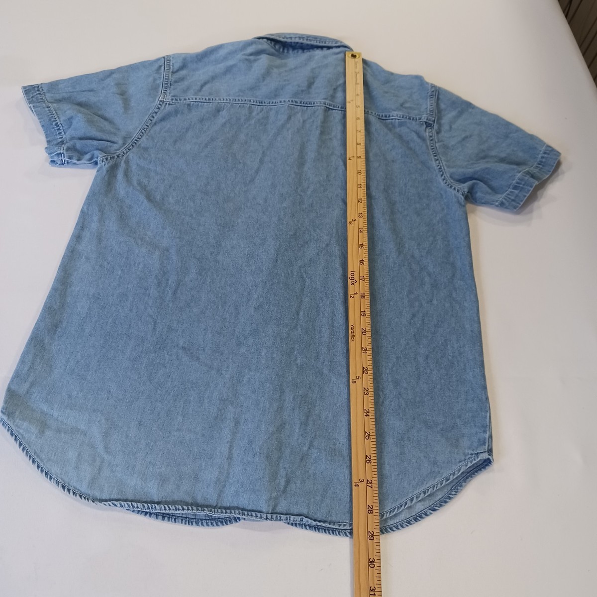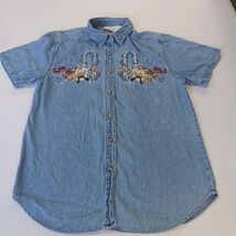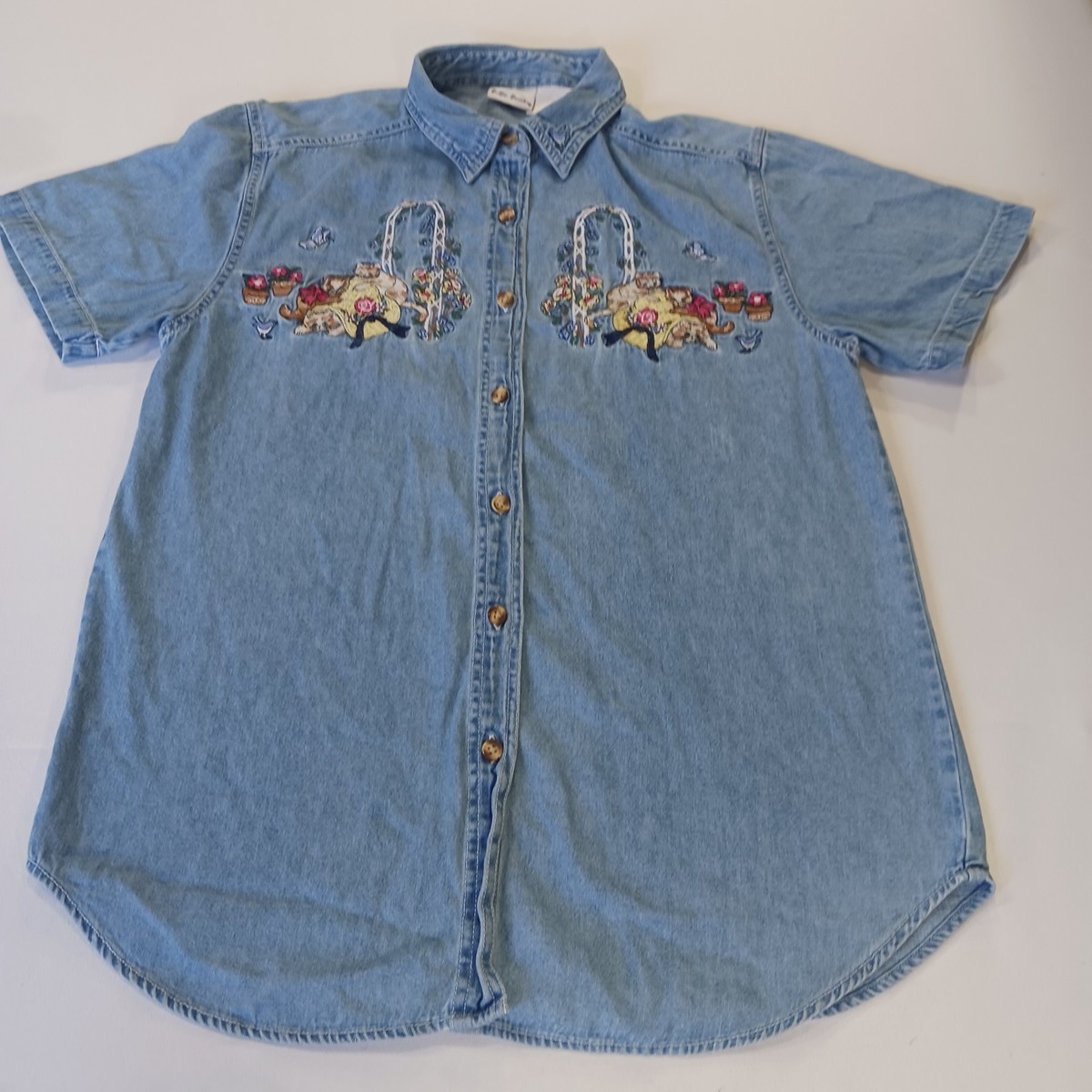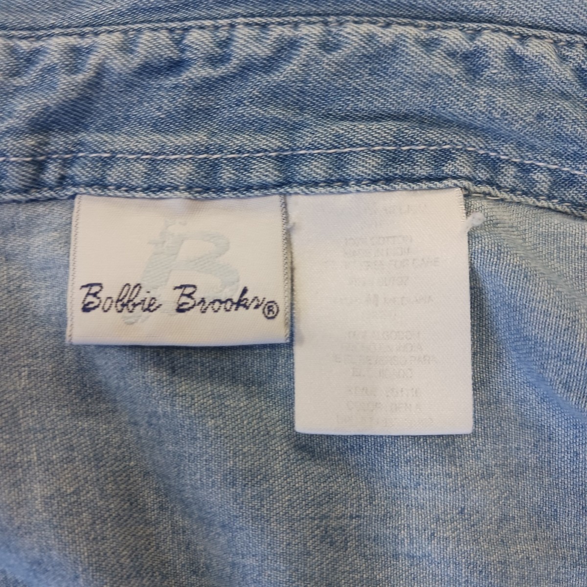 The Vintage Bobbie Brooks Women's Blue Denim Short Sleeve Shirt is a stylish piece of women's vintage clothing from the 1990s. This shirt features intricate embroidery on the chest, adding a unique embellished touch to the classic blue denim design. Made of cotton, this shirt is perfect for casual occasions and is a great addition to any vintage clothing collection.