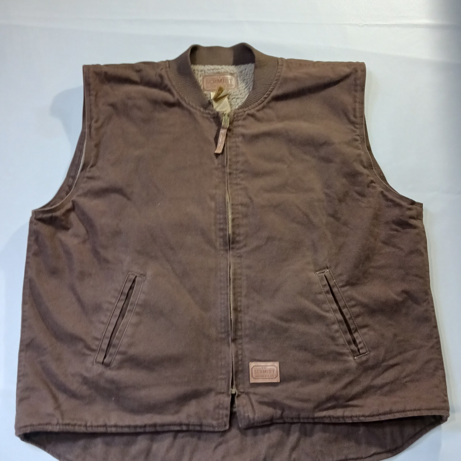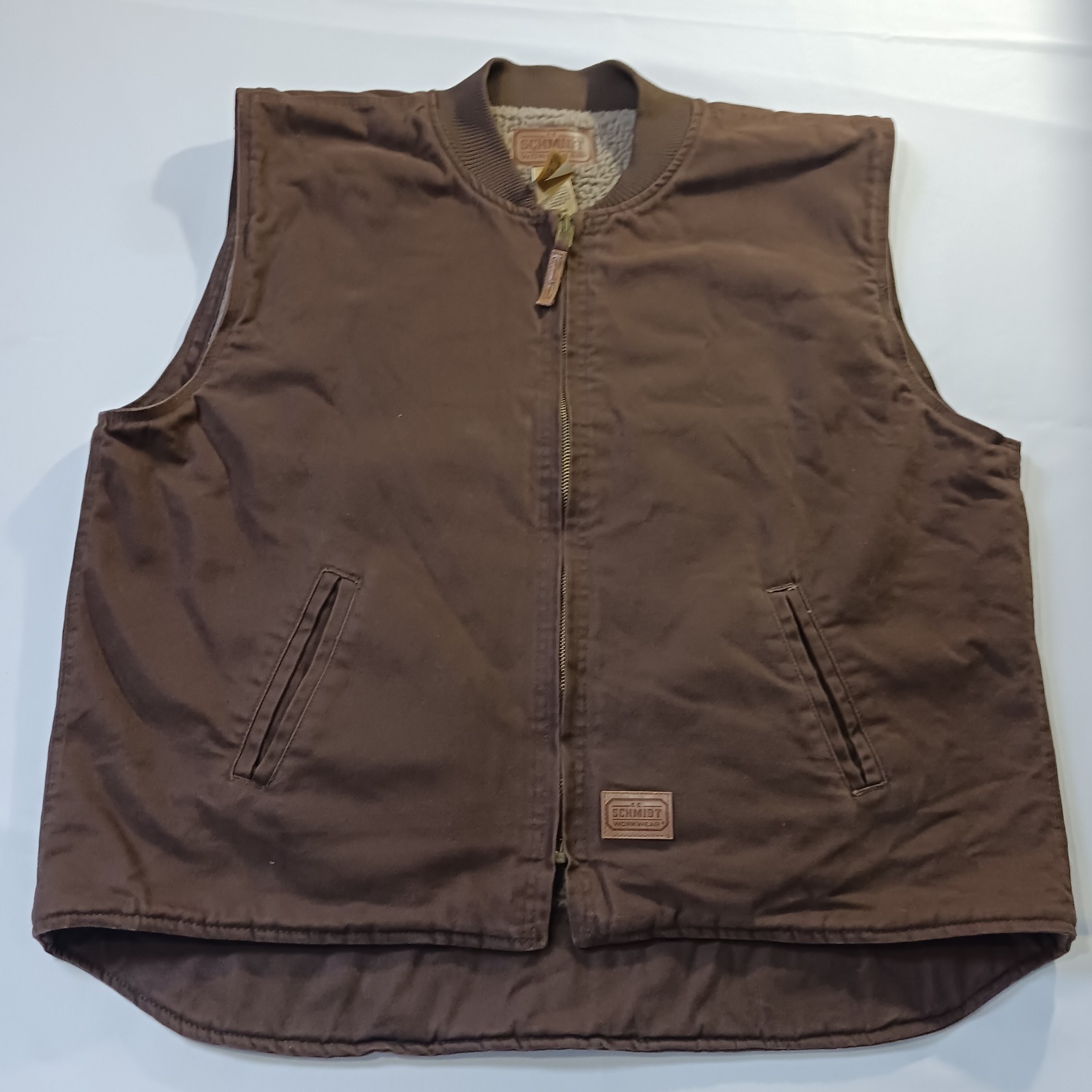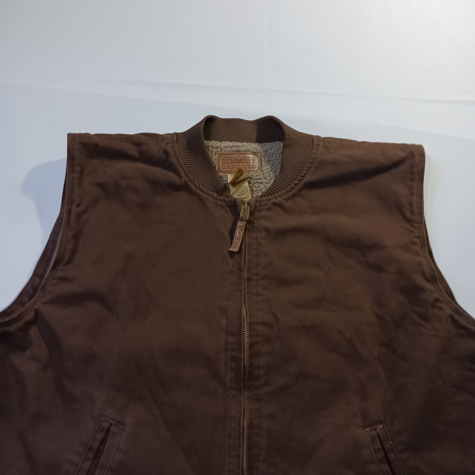 The Vintage C.E. Schmidt Workwear TV53BB Men's 2XLR Brown Cotton Blend Full Zip Vest is a classic piece of workwear with a twist of retro charm. Made from a durable cotton blend with a canvas fabric type, this vest features a spread collar, zip closure, and lined interior for added warmth. Perfect for outdoor activities like hunting, this bomber jacket style vest in a solid brown color is a versatile and stylish addition to any man's wardrobe. Machine washable and with a chest size of 56 inches, this vest is a timeless piece for the winter, fall, and spring seasons.