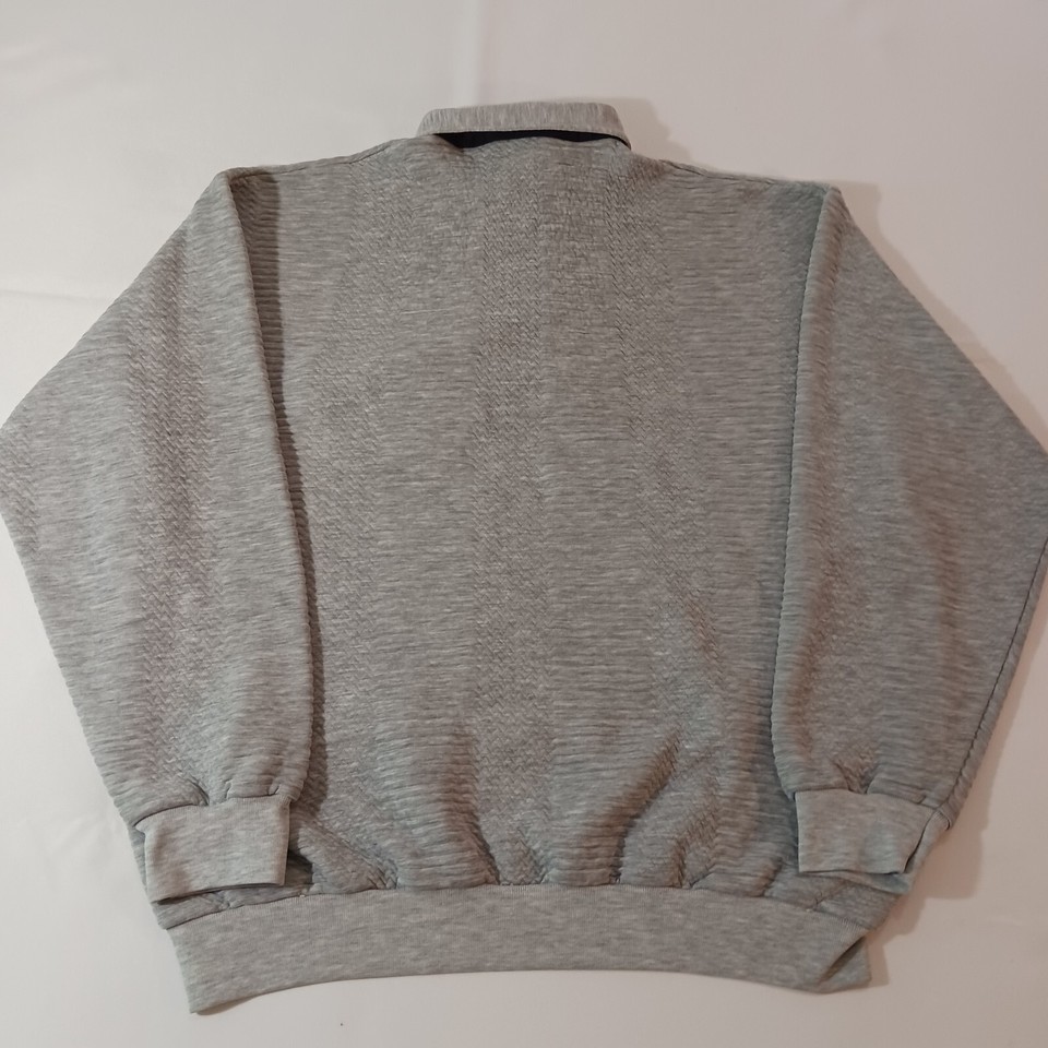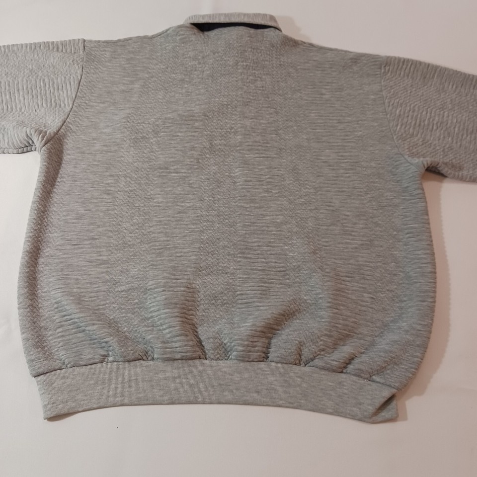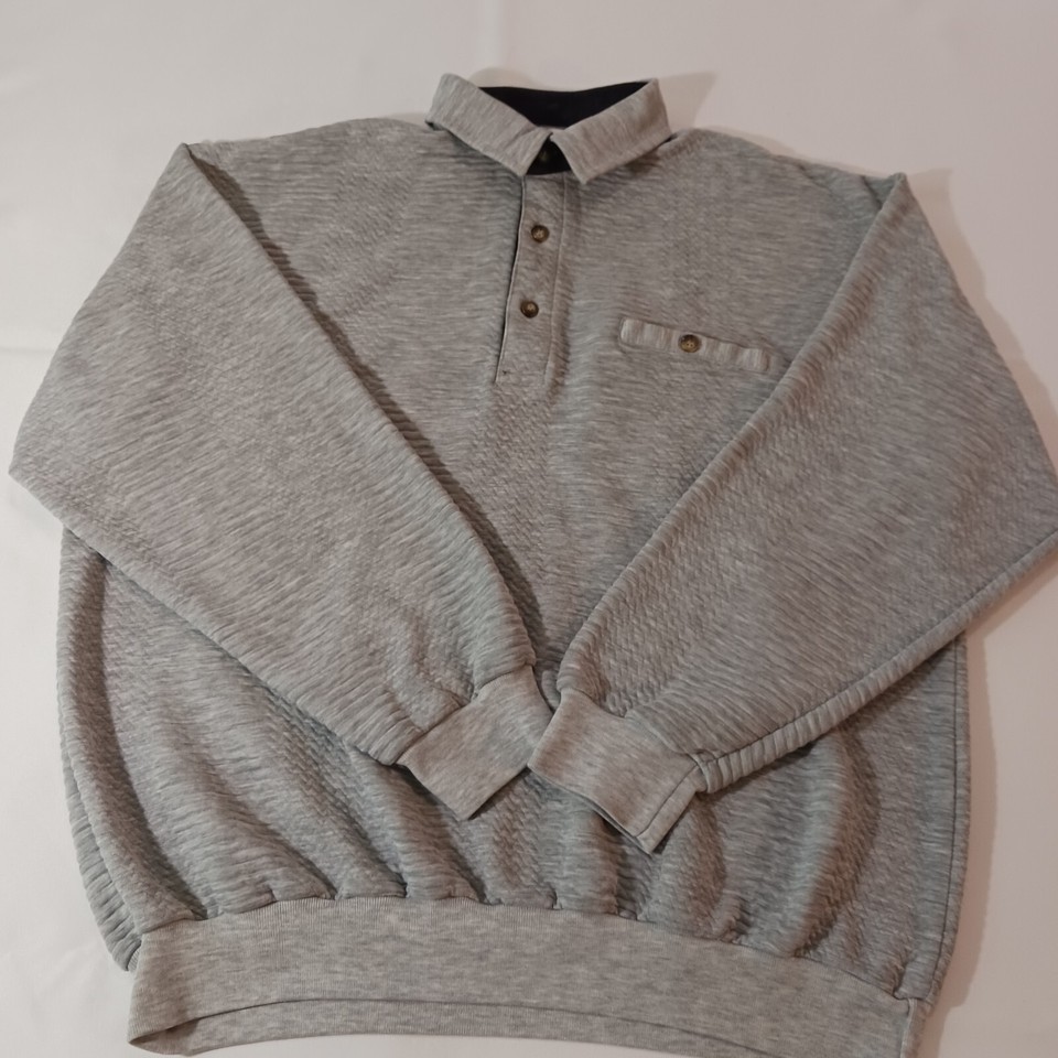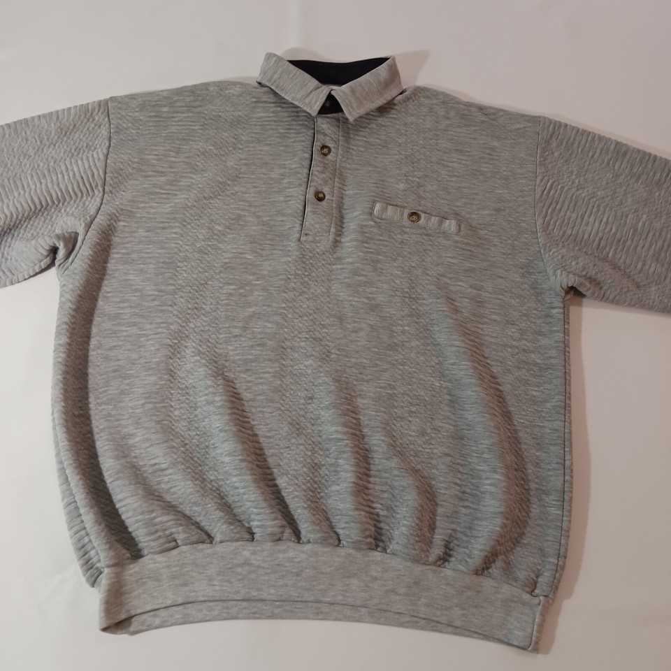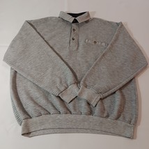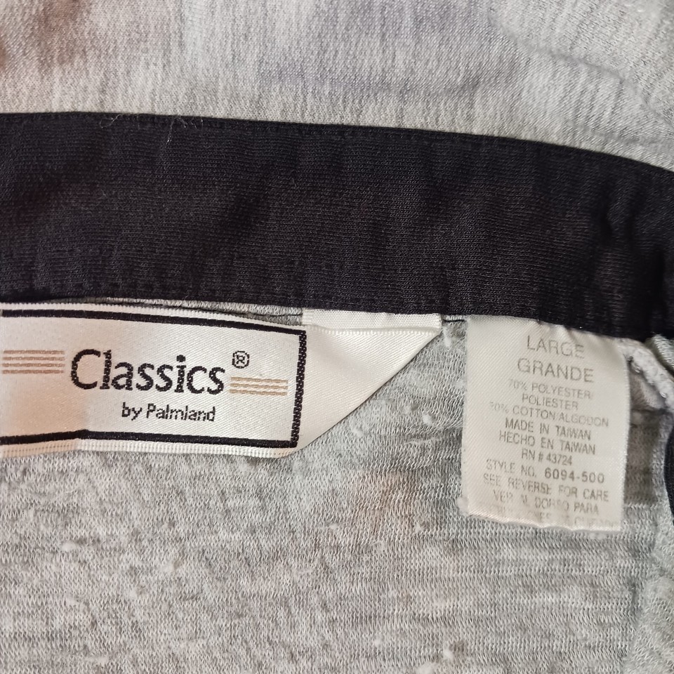This Vintage Classics By Palmland Men's Polo Pullover Sweater in size L features a collared neckline with a spread collar style and a pullover closure. Made of a cotton-polyester blend knit fabric in a solid gray color, this polo sweater has long sleeves and a chest size of 46 inches. It is designed with easy-care properties, making it suitable for all seasons and occasions such as travel, activewear, and casual wear. Additionally, it includes pockets for added functionality and is part of the Classics By Palmland product line originating from Taiwan.