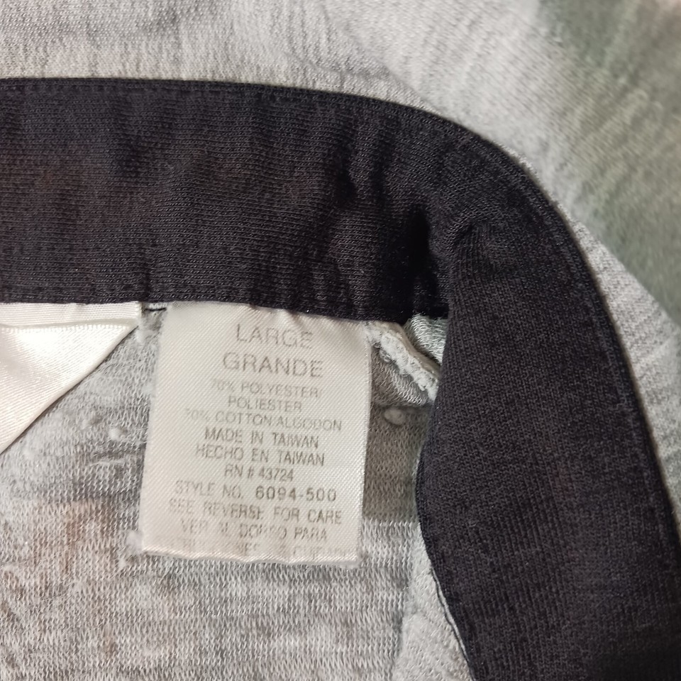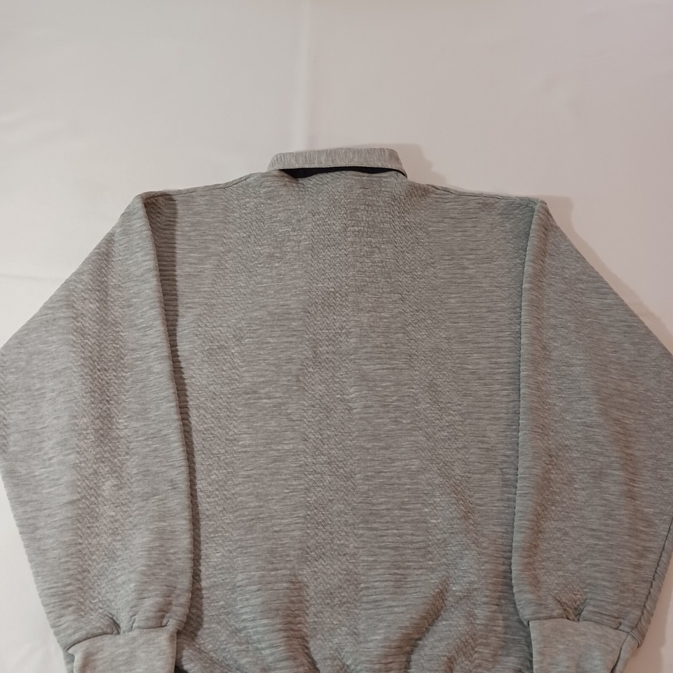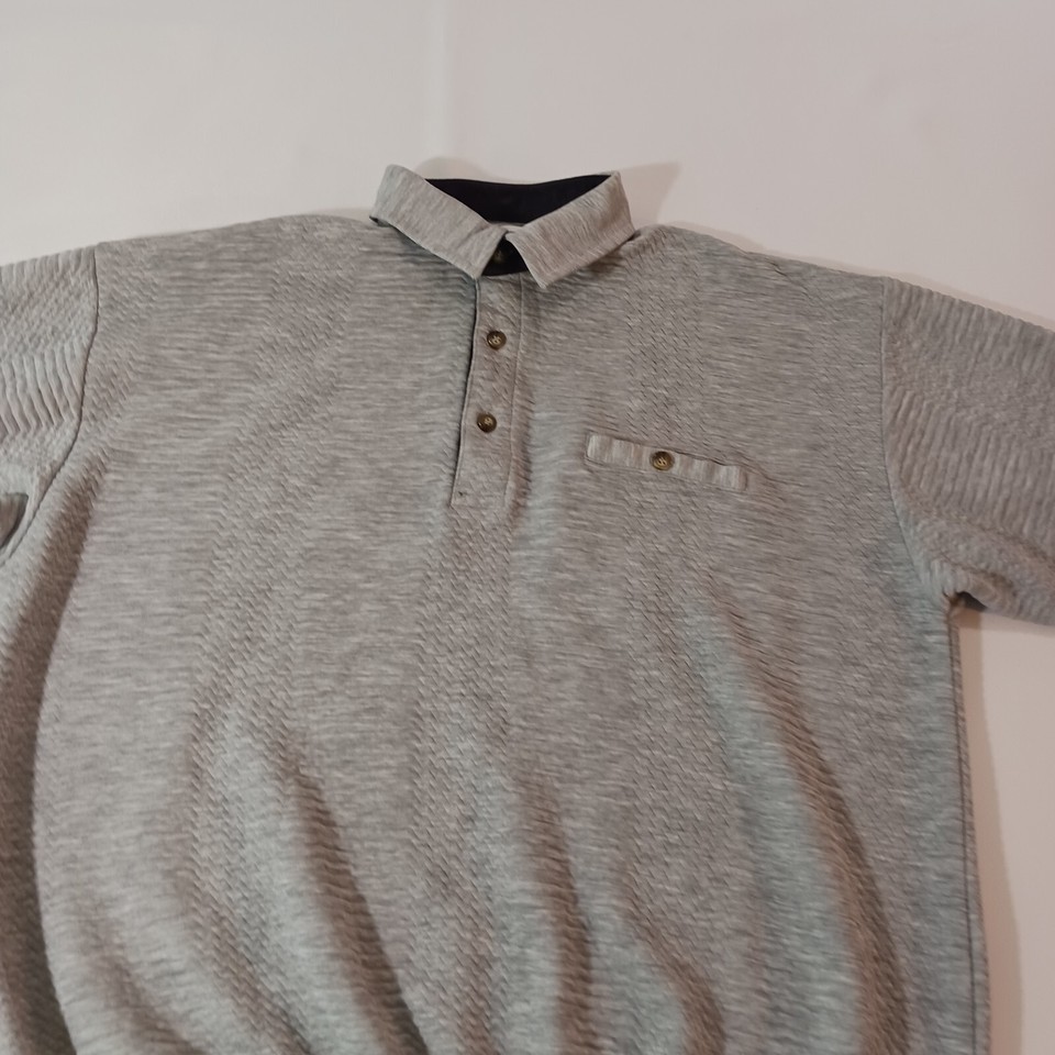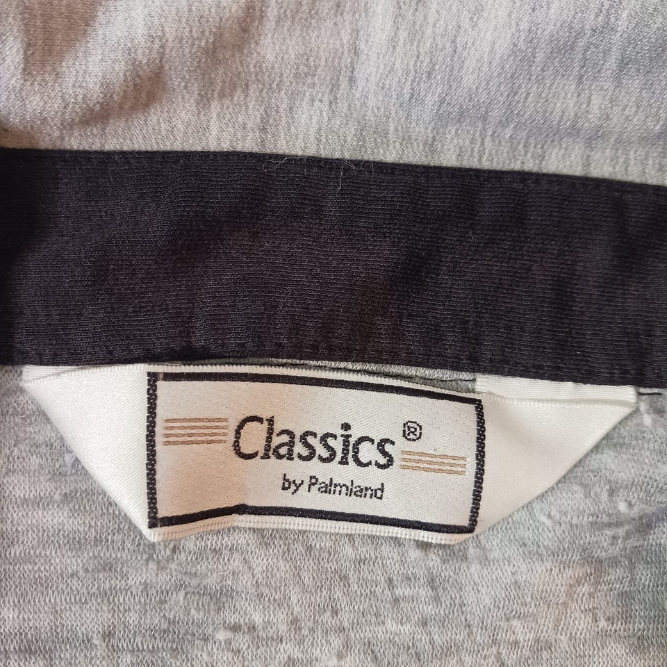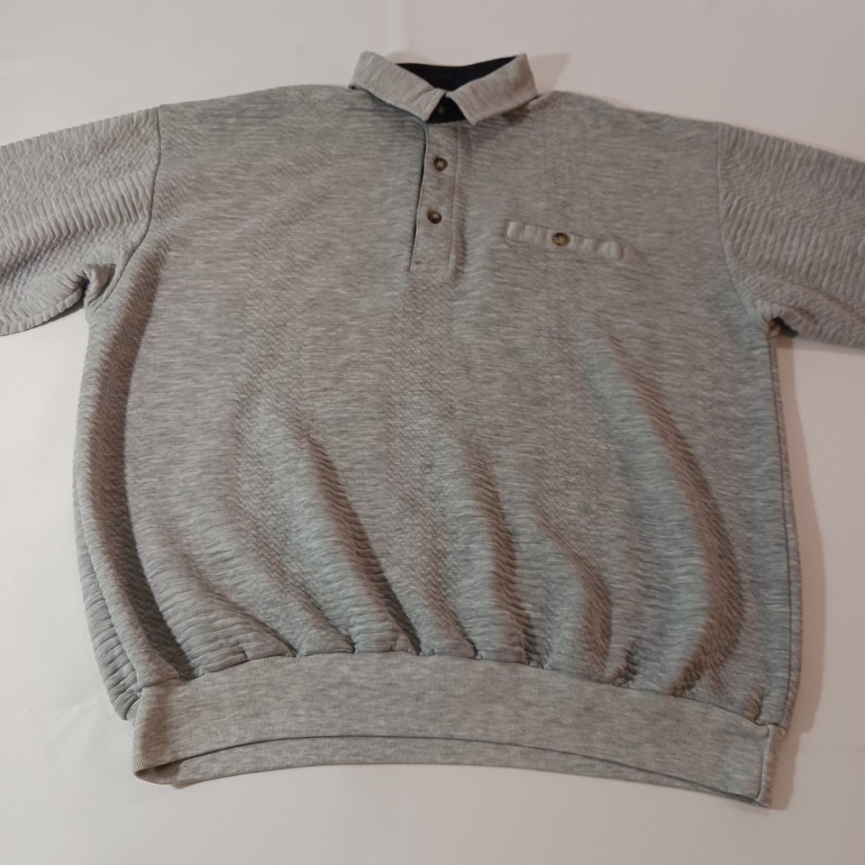 This Vintage Classics By Palmland Men's Polo Pullover Sweater in size L features a collared neckline with a spread collar style and a pullover closure. Made of a cotton-polyester blend knit fabric in a solid gray color, this polo sweater has long sleeves and a chest size of 46 inches. It is designed with easy-care properties, making it suitable for all seasons and occasions such as travel, activewear, and casual wear. Additionally, it includes pockets for added functionality and is part of the Classics By Palmland product line originating from Taiwan.