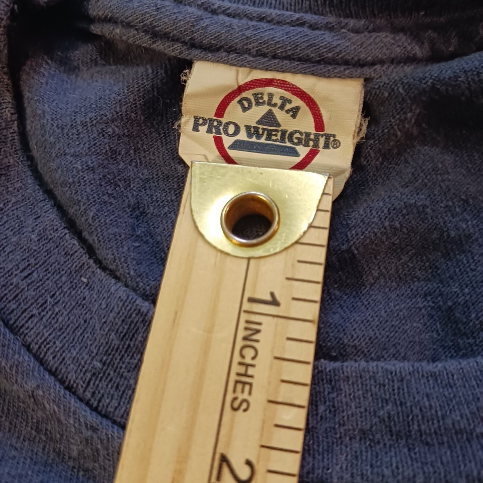 Show your love for the University of Michigan with this vintage Delta Pro Weight T-shirt. The blue shirt features a long sleeve design and a solid pattern. It is made of cotton and cotton blend materials, making it comfortable to wear during fall, winter and spring seasons. The shirt also has a University of Michigan logo accent, making it a perfect addition to any fan's collection. The shirt is in great shape and is ideal for both men and women who love to show their support for their favorite college team.