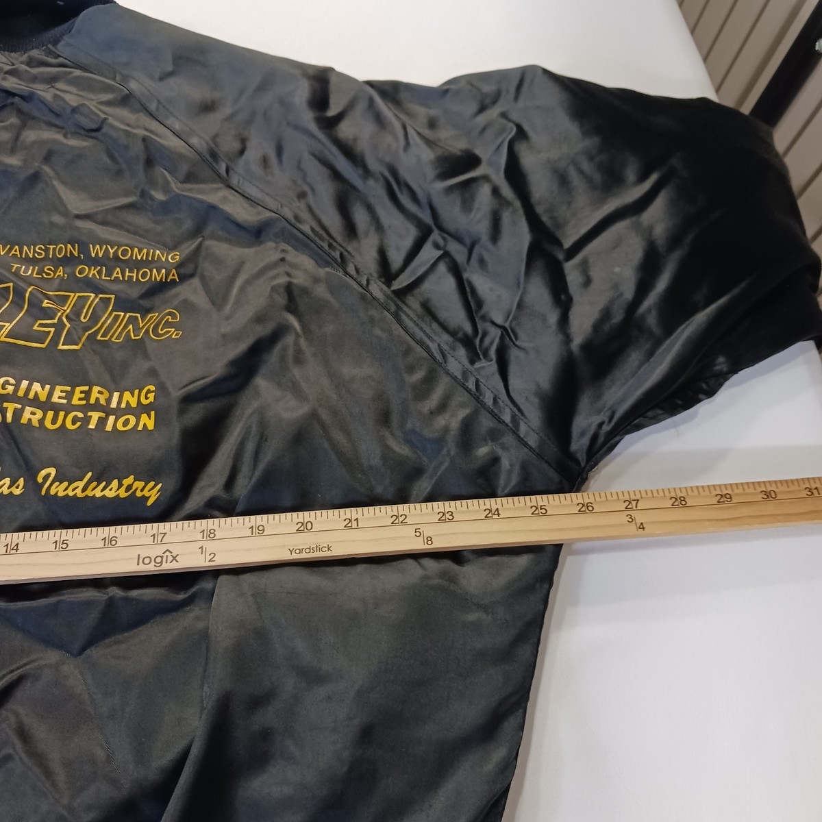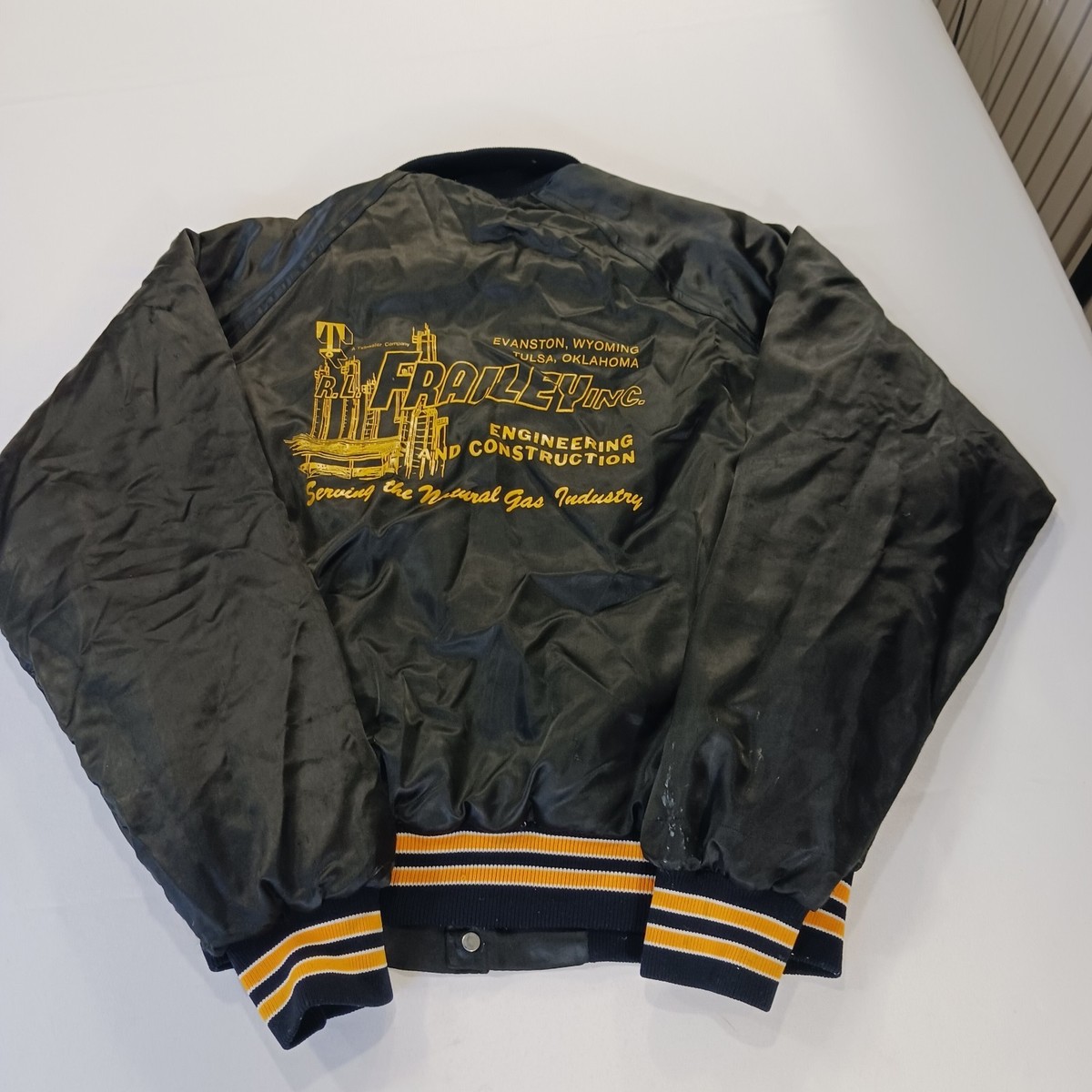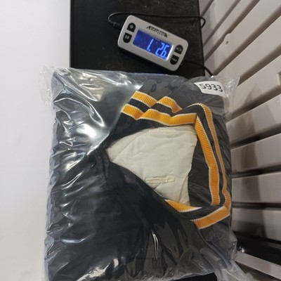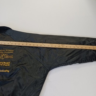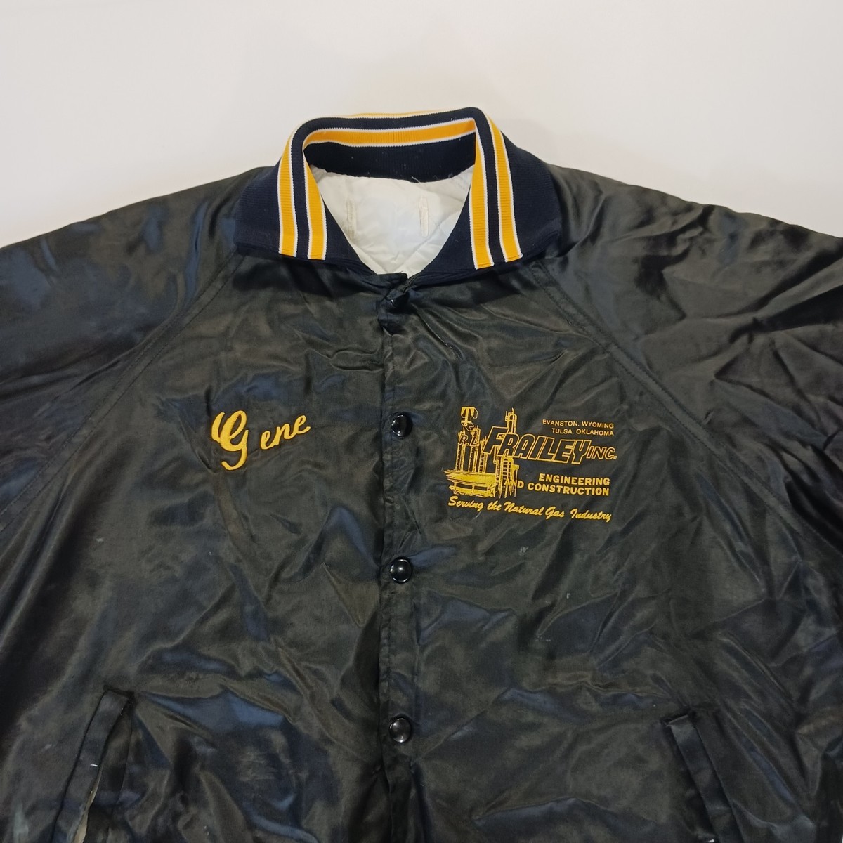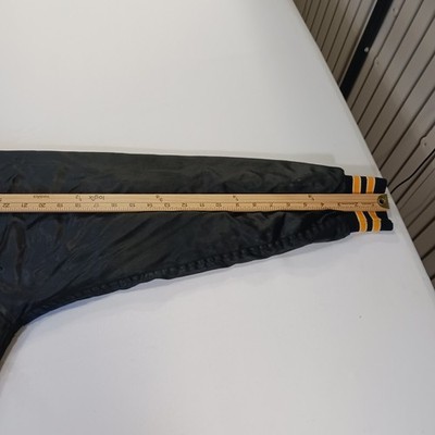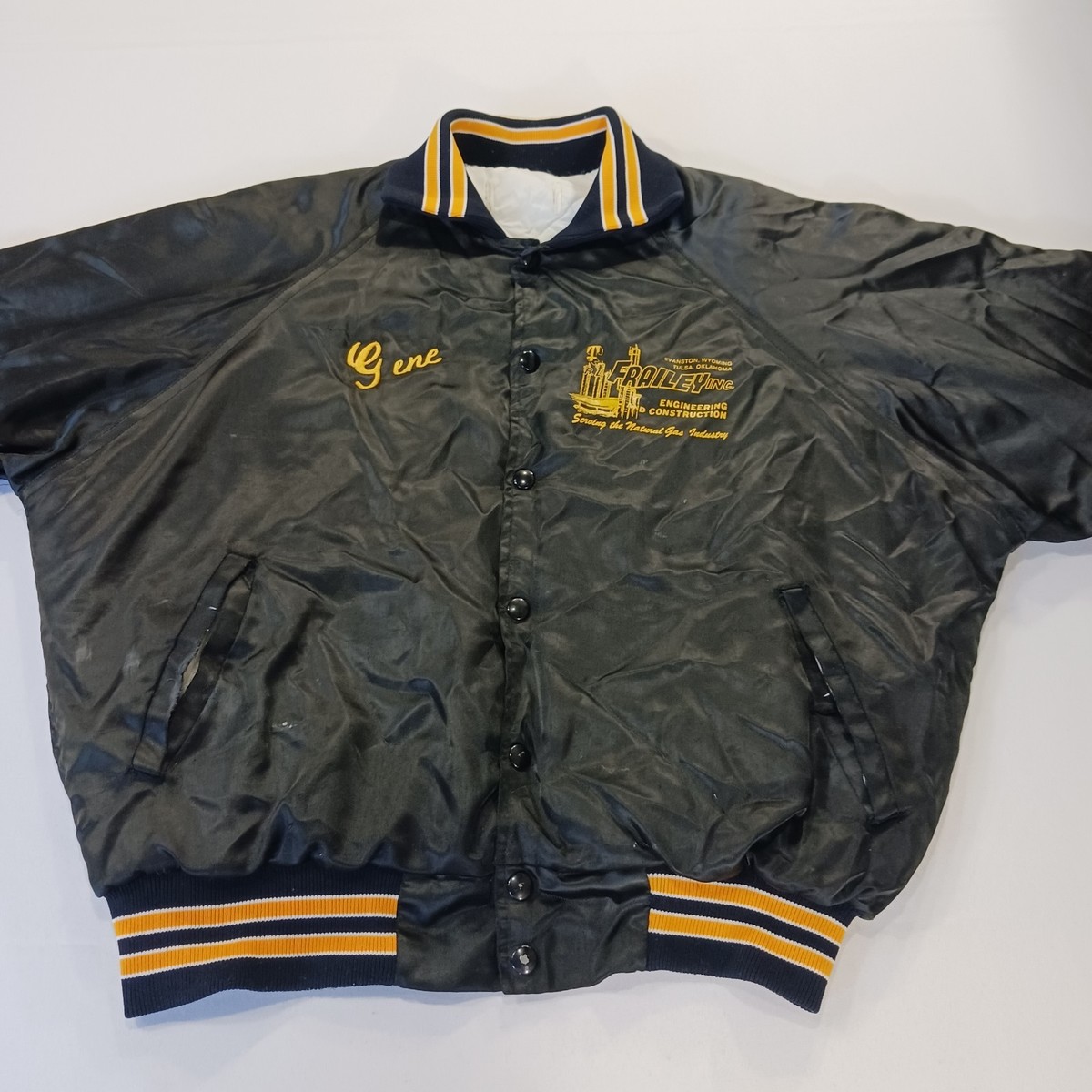 The Vintage FRAILED Men's Black/Yellow Distressed Varsity Jacket is a stylish and unique piece for casual occasions. Made of nylon with a solid blue color and featured accents like embroidered logos, this jacket has a stand-up collar and snap closure. With a chest size of 52 inches and a length of 26 inches, this lined jacket exudes a firefighter theme, perfect for adding a touch of retro flair to your wardrobe. Hand wash only to preserve the vintage charm of this classic varsity jacket.