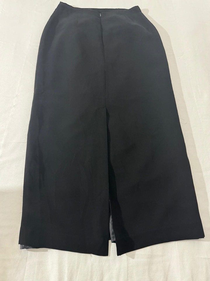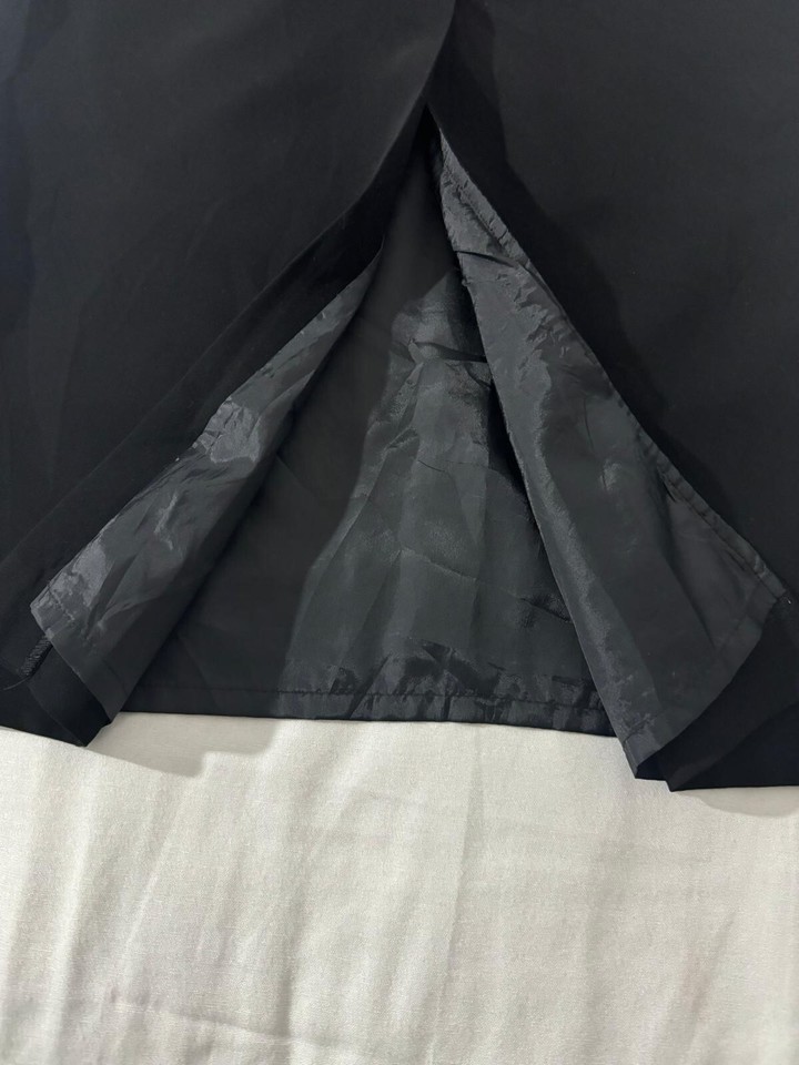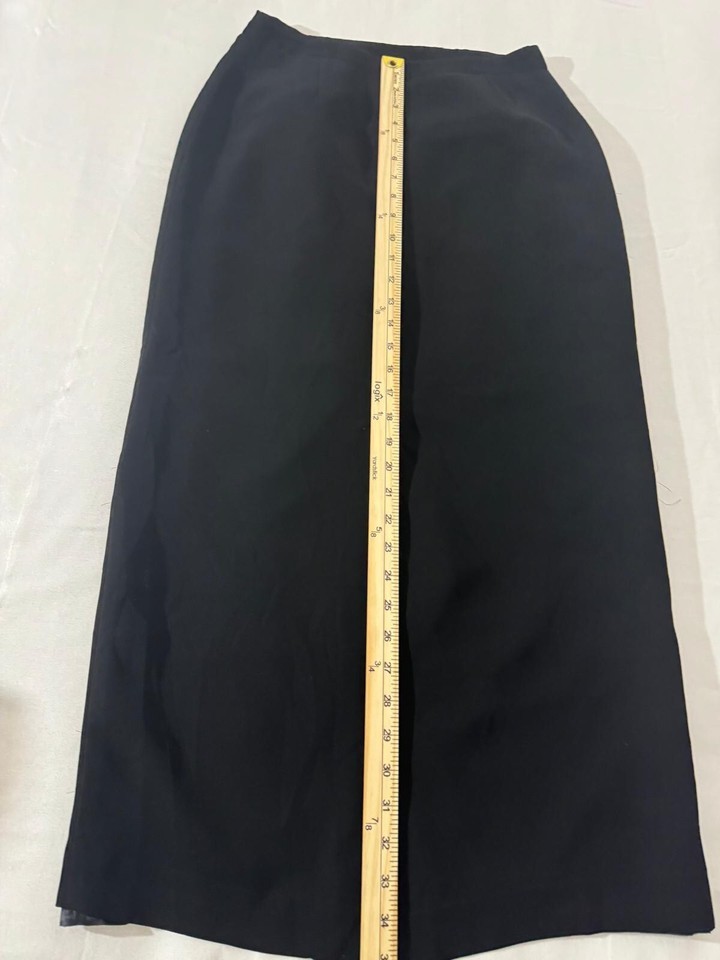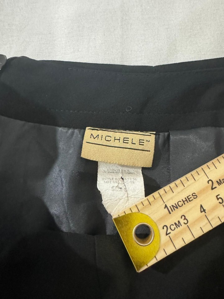 This vintage Michele pencil skirt for women features a sleek black design with a rear zipper for easy wear and a slit for added style and movement. The skirt is a pull-on style, making it convenient and comfortable to wear. With a waist measurement of 27 inches, this pencil skirt is a timeless and sophisticated piece that can be styled for various occasions, adding a touch of elegance to any outfit.