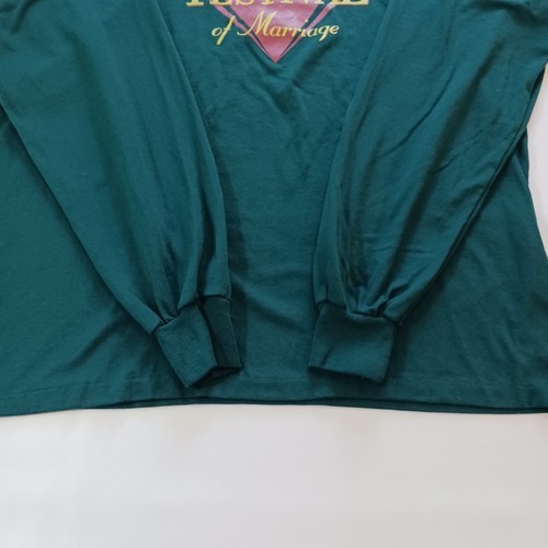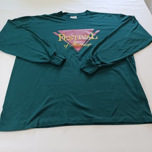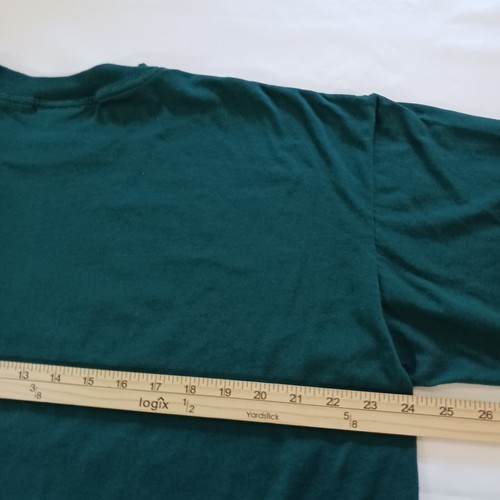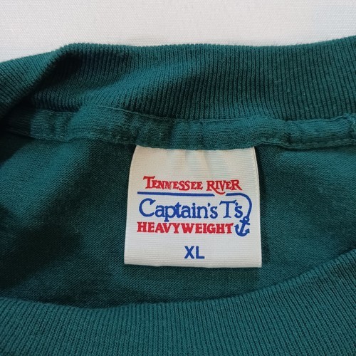 This is a vintage Tennessee River Captain's T's Heavyweight men's t-shirt in size XL. The shirt features a solid green color with a crew neck and long sleeves. It is made of a knit fabric type with a graphic logo and single stitch accents. The shirt is pre-owned and has a vintage look, making it perfect for festival, marriage, or vintage-themed events. It is machine washable and suitable for all seasons.