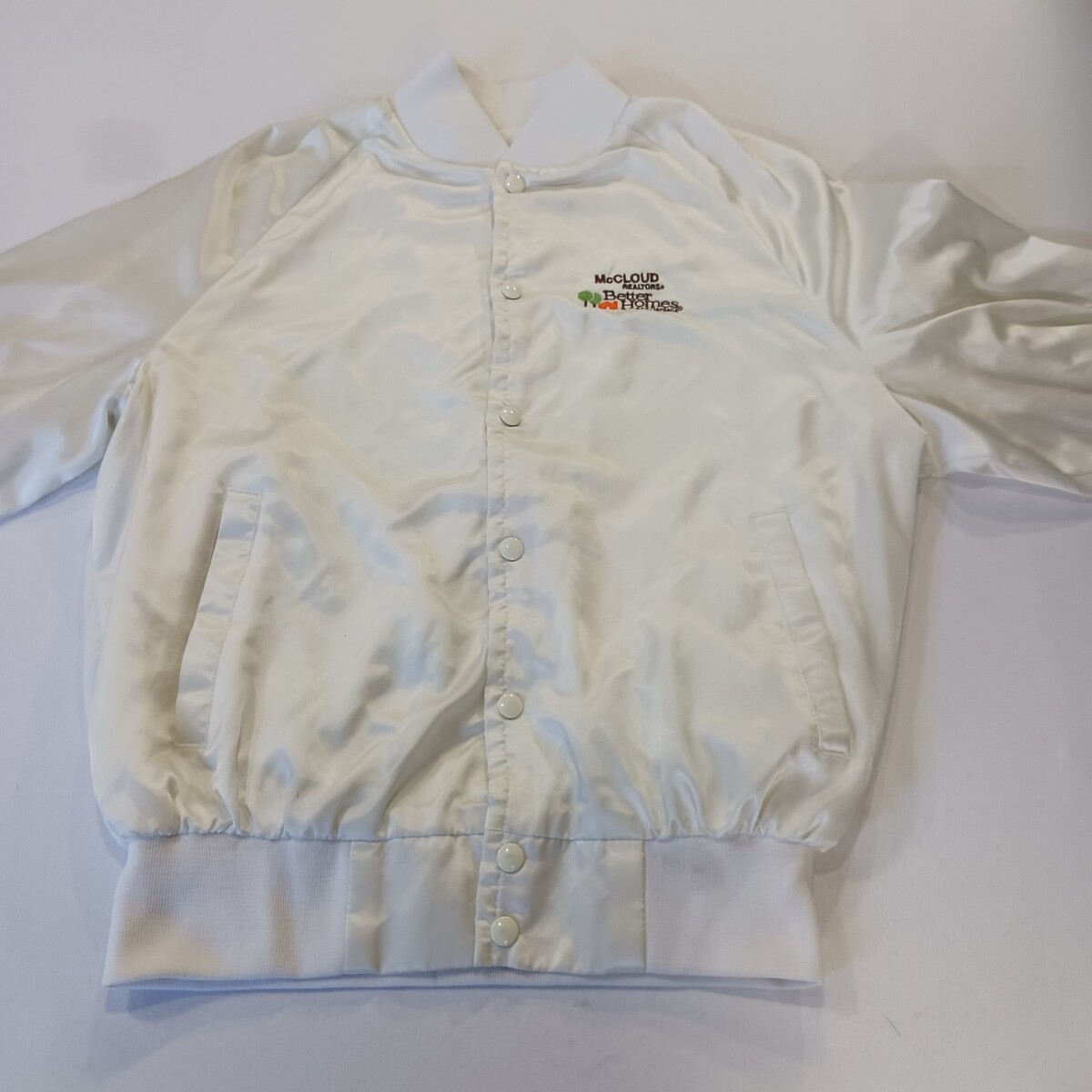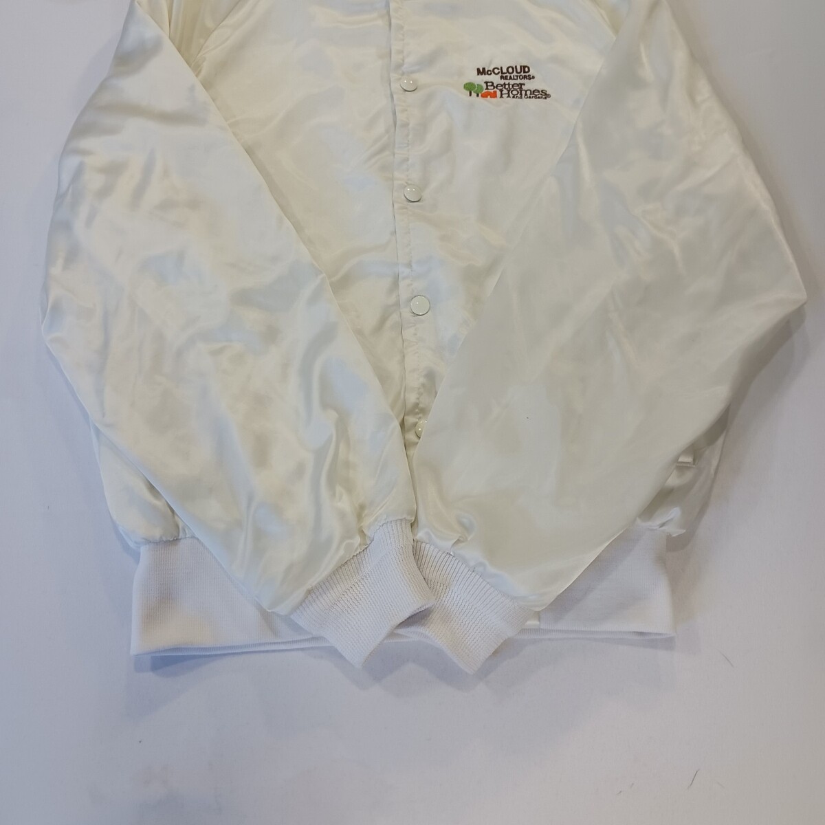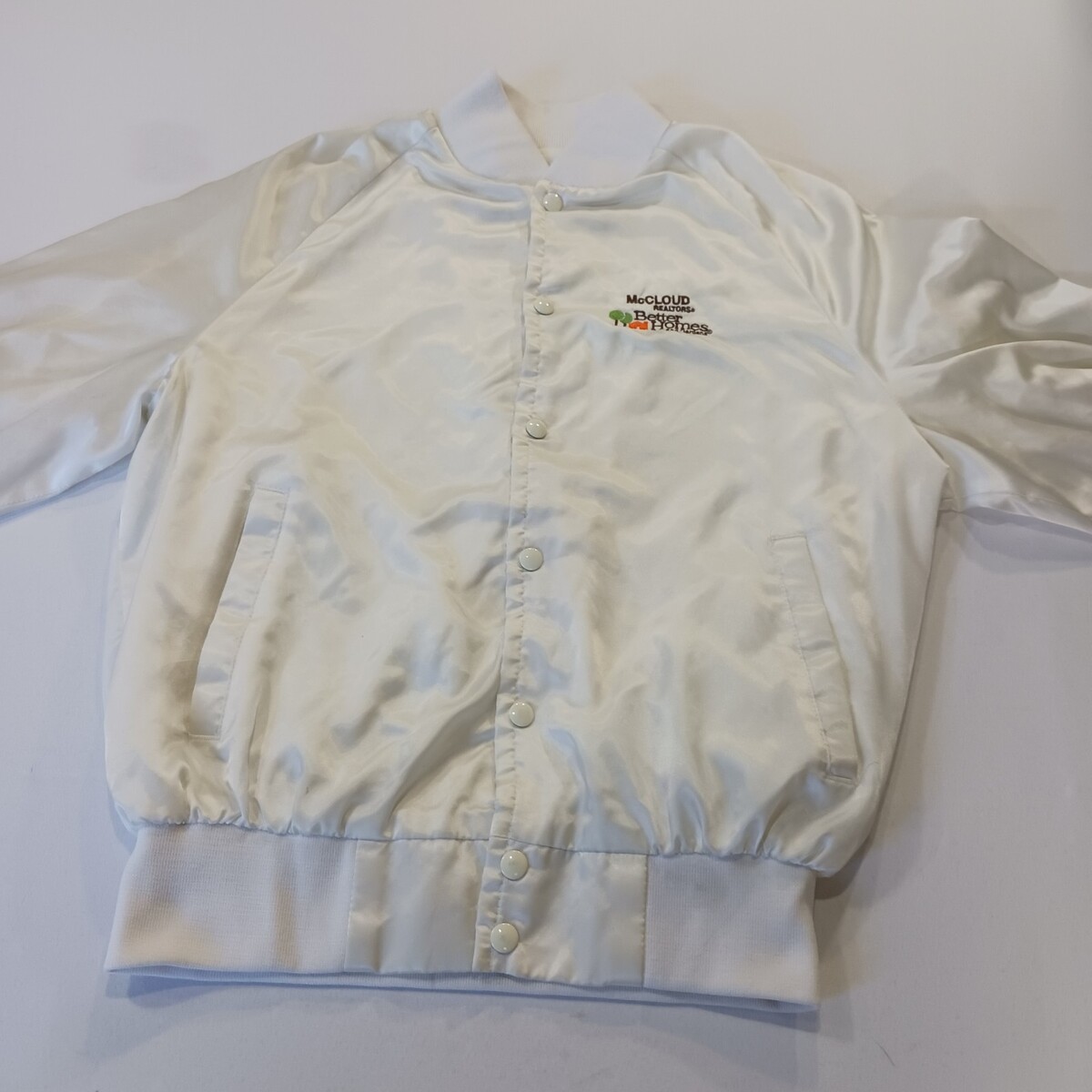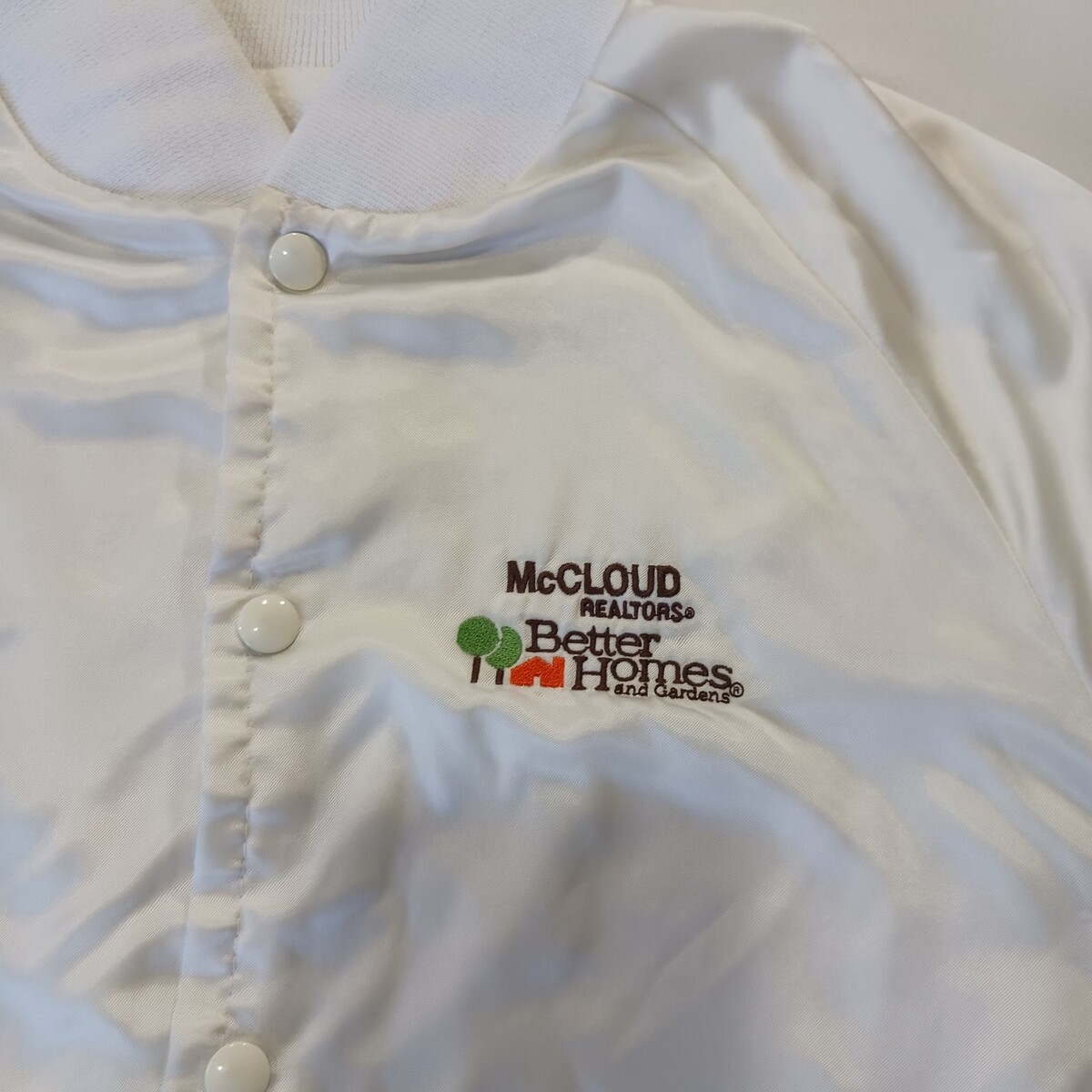 This vintage men's white jacket from The Knit Shirt Exchange McCloud Realtors features embroidered accents and a button closure. Made of polyester knit fabric, the jacket is styled as a windbreaker with a retro theme inspired by the USA, 80s, and 90s. The red color adds a pop of vibrancy to the classic design, making it a stylish and unique addition to any wardrobe.