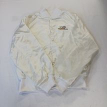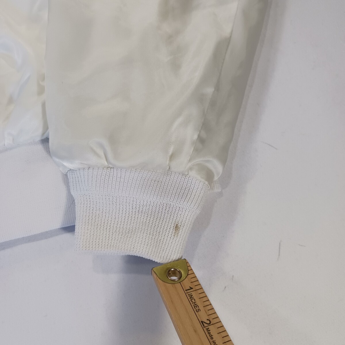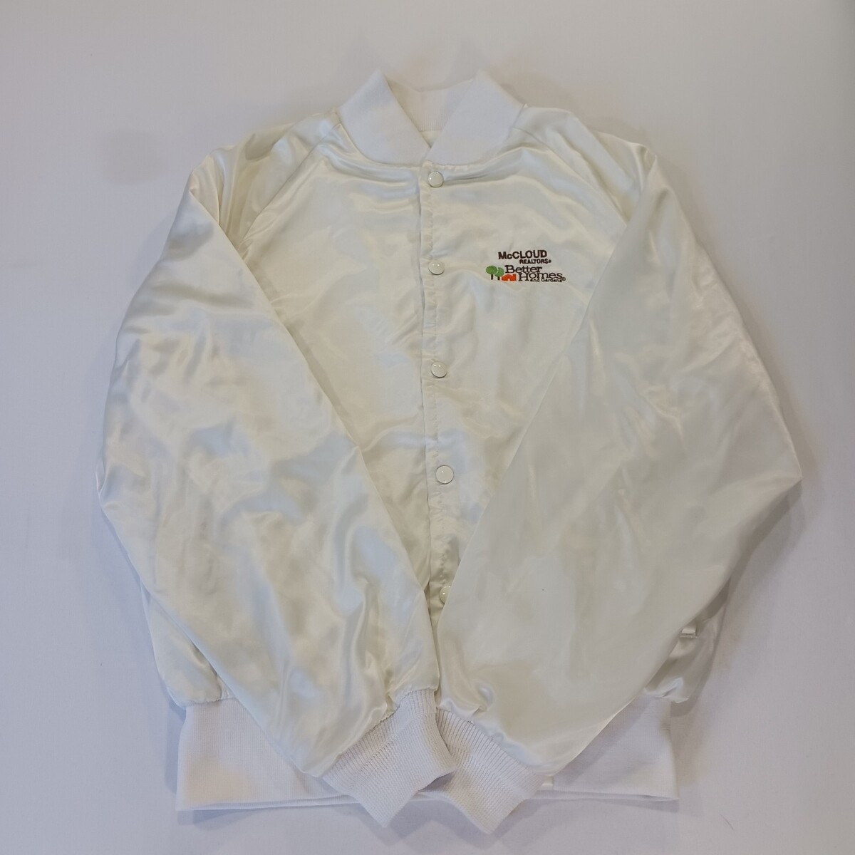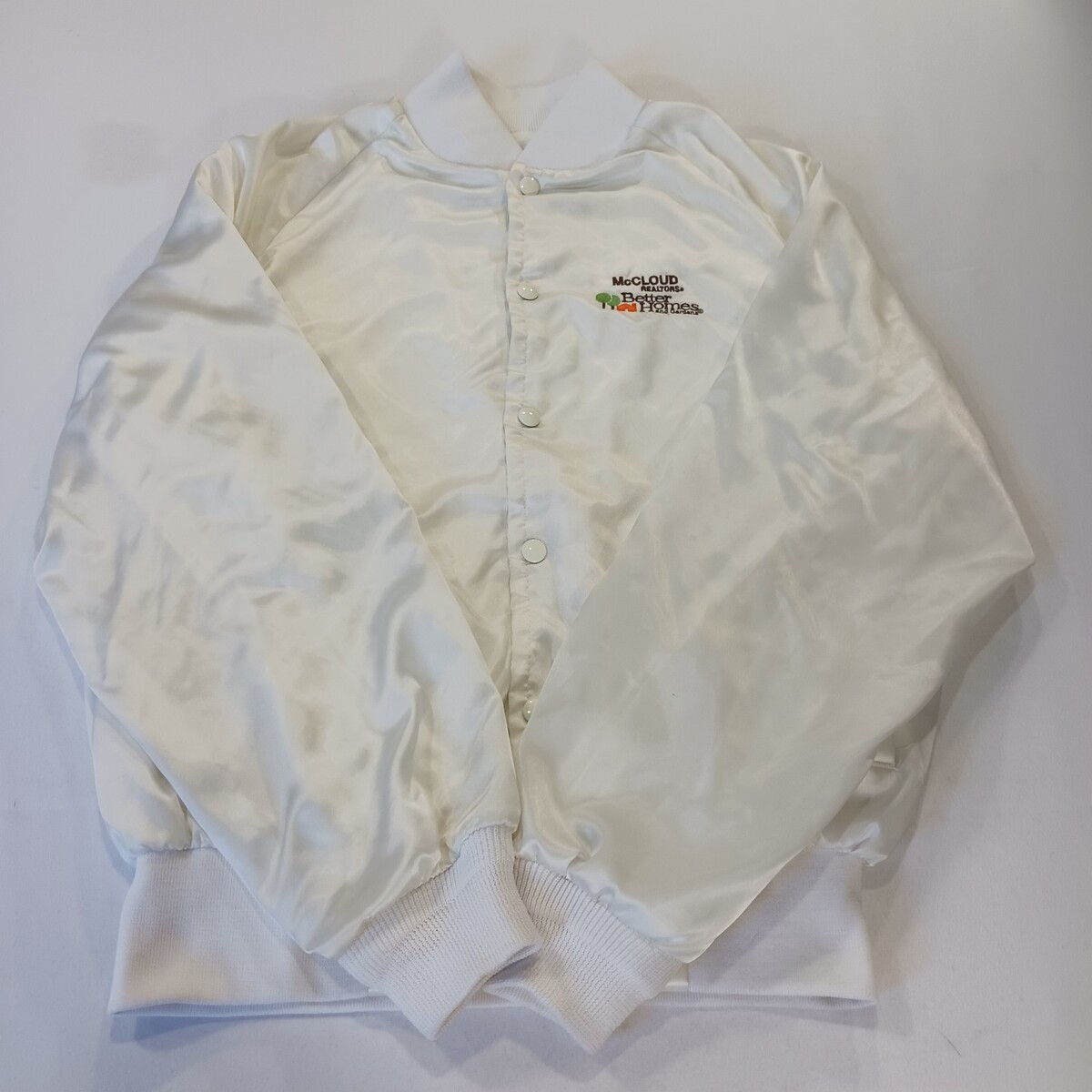 This vintage men's white jacket from The Knit Shirt Exchange McCloud Realtors features embroidered accents and a button closure. Made of polyester knit fabric, the jacket is styled as a windbreaker with a retro theme inspired by the USA, 80s, and 90s. The red color adds a pop of vibrancy to the classic design, making it a stylish and unique addition to any wardrobe.