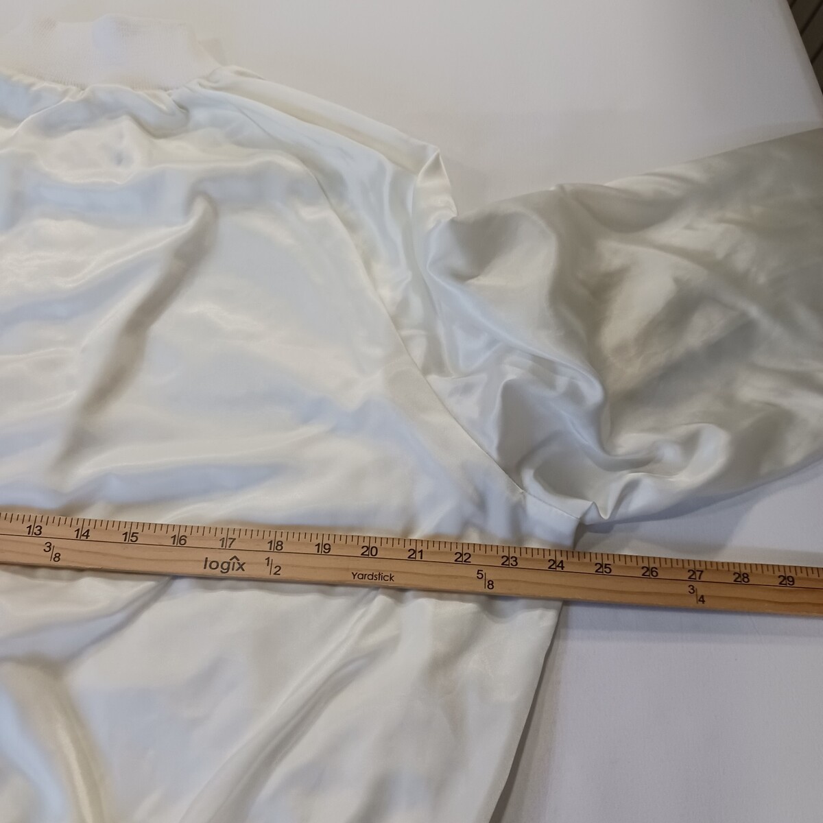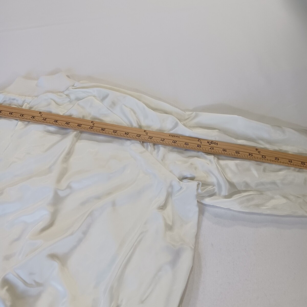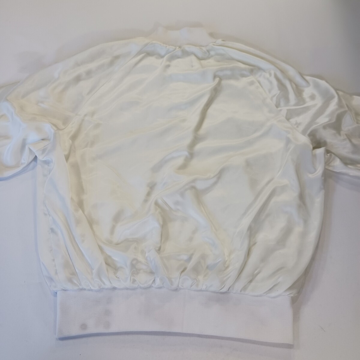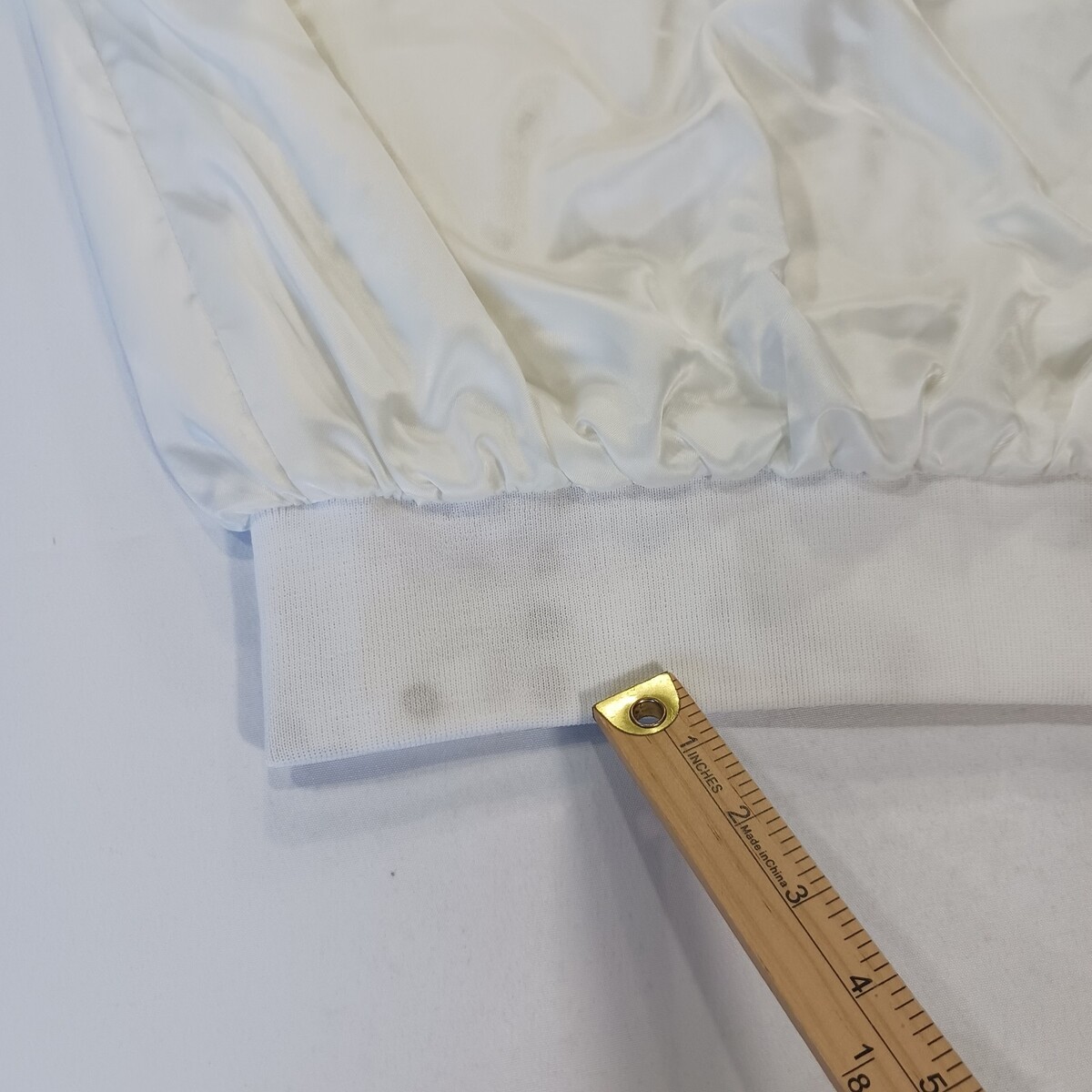 This vintage men's white jacket from The Knit Shirt Exchange McCloud Realtors features embroidered accents and a button closure. Made of polyester knit fabric, the jacket is styled as a windbreaker with a retro theme inspired by the USA, 80s, and 90s. The red color adds a pop of vibrancy to the classic design, making it a stylish and unique addition to any wardrobe.