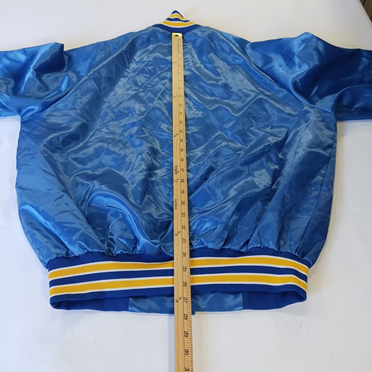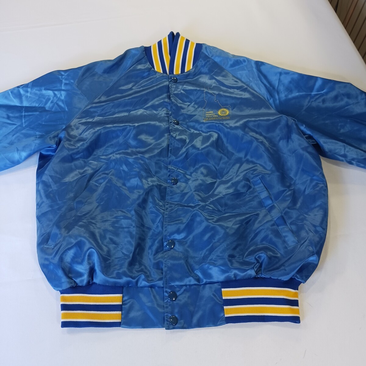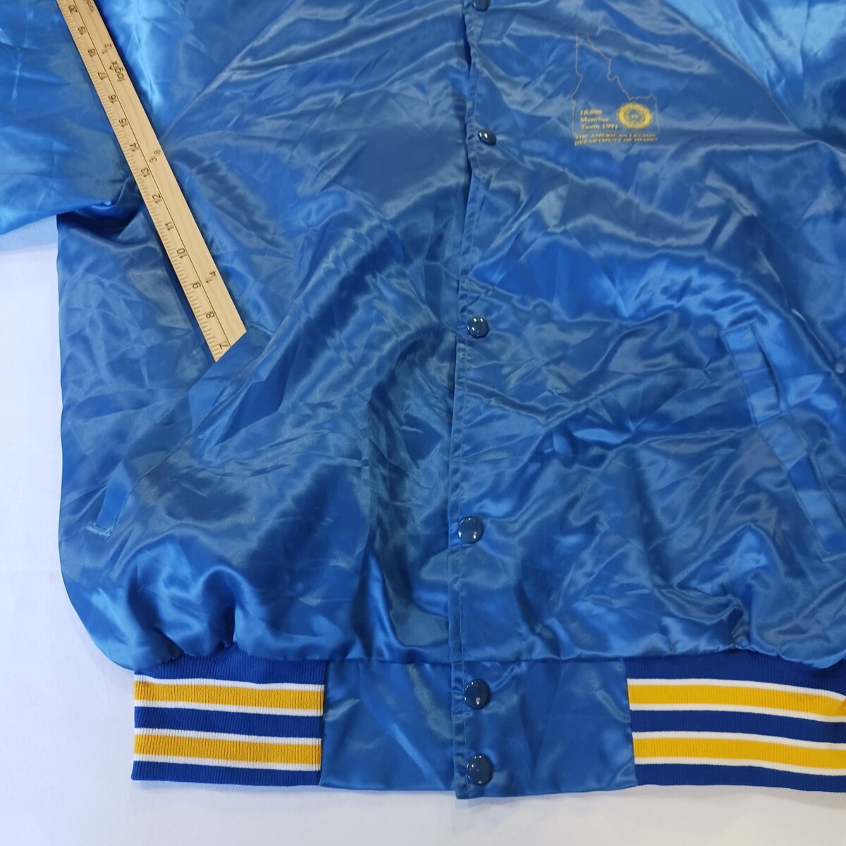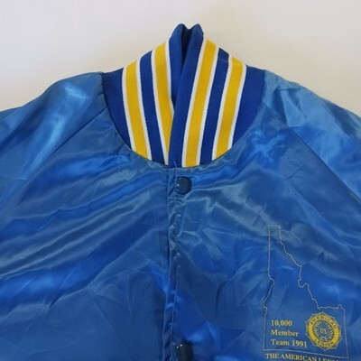 The Vintage Westark RN#66815 American Legion Dept. Men's Blue Baseball Jacket in size XL is a stylish bomber jacket made of satin with a nylon lining. Featuring a snap closure and accents like buttons and a zipper, this lightweight jacket is perfect for all seasons and occasions, including travel, parties, and casual outings. With a solid blue color and a 28-inch length, this jacket also has pockets for added convenience. Ideal for riding, walking, or hiking, this Westark jacket with a USA theme is a classic addition to any man's wardrobe.