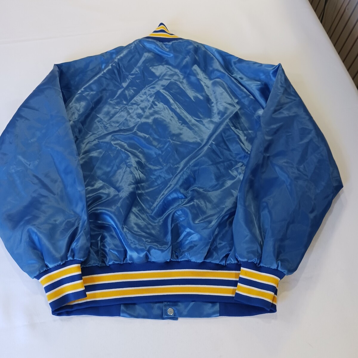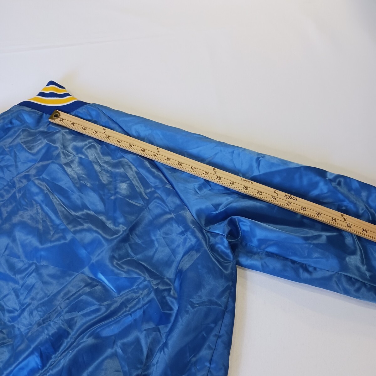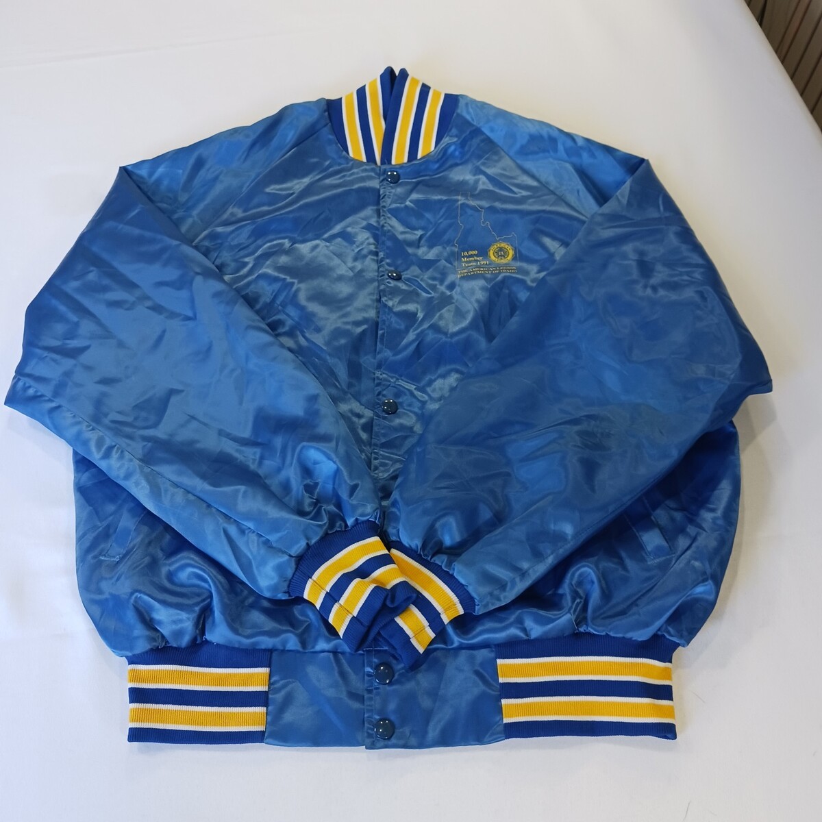 The Vintage Westark RN#66815 American Legion Dept. Men's Blue Baseball Jacket in size XL is a stylish bomber jacket made of satin with a nylon lining. Featuring a snap closure and accents like buttons and a zipper, this lightweight jacket is perfect for all seasons and occasions, including travel, parties, and casual outings. With a solid blue color and a 28-inch length, this jacket also has pockets for added convenience. Ideal for riding, walking, or hiking, this Westark jacket with a USA theme is a classic addition to any man's wardrobe.