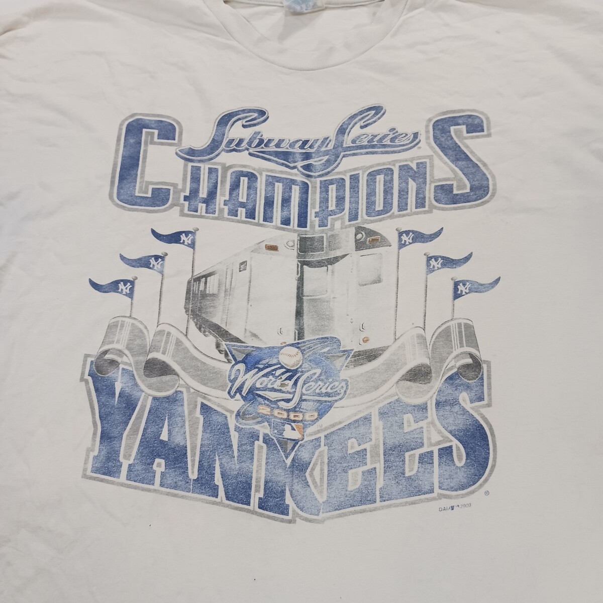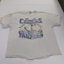 This vintage 2000 New York Yankees Subway Series Champions men's XL white graphic t-shirt is a must-have for any sports fan. Made of cotton and featuring a solid design with a crew neck and short sleeves, this shirt is machine washable and showcases the iconic Yankees logo as an accent. The regular fit and classic t-shirt style make it a versatile piece for any season, perfect for showing off your team spirit in style.
