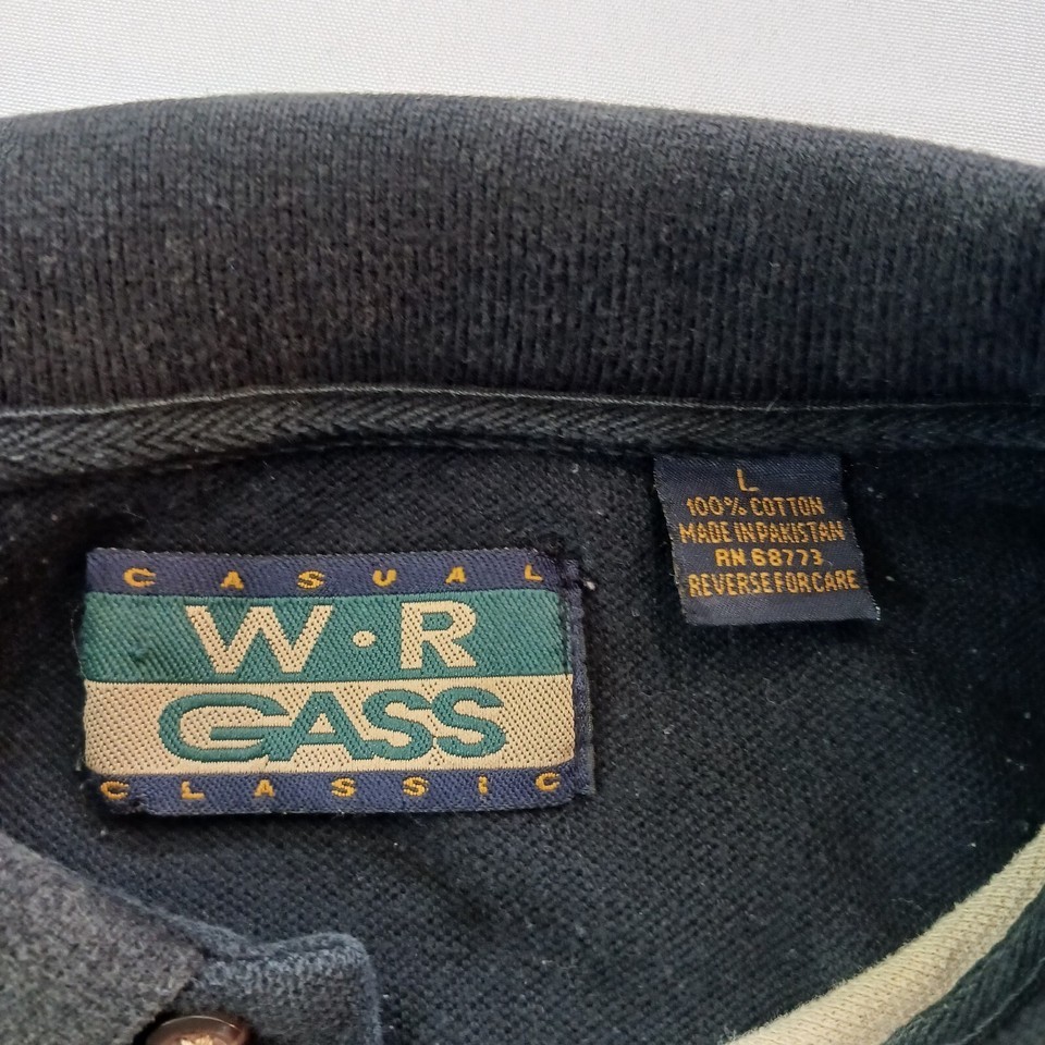 This is a pre-owned W.R. Gass men's shirt made of gray cotton. It has a collared neckline, long sleeves, and a pull-over closure. The shirt has a solid pattern and a regular fit, making it suitable for casual, workwear, and business occasions. It is a size large and a regular size type. The shirt is a button-up type and was manufactured in Pakistan.