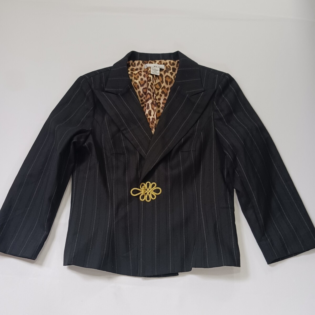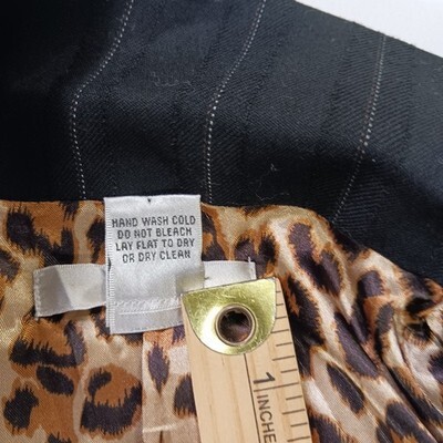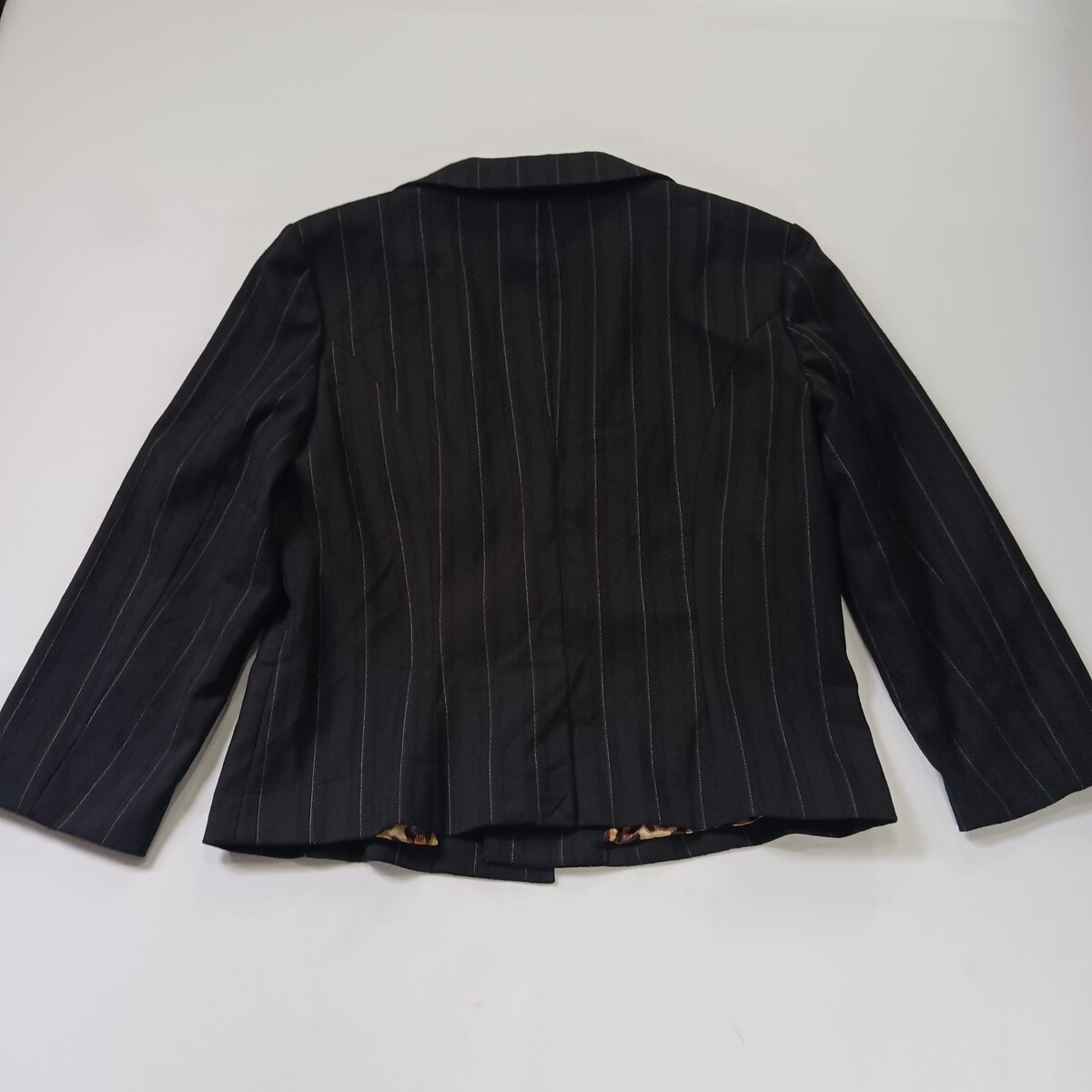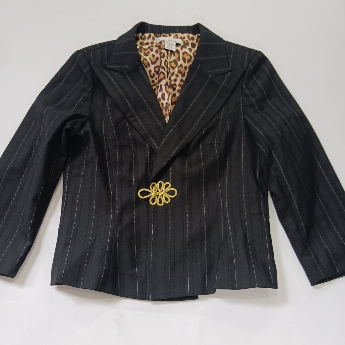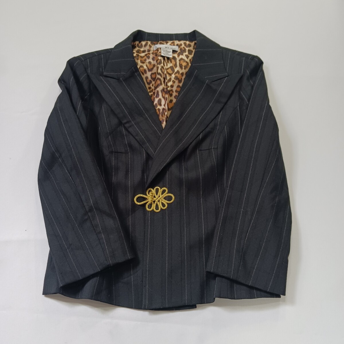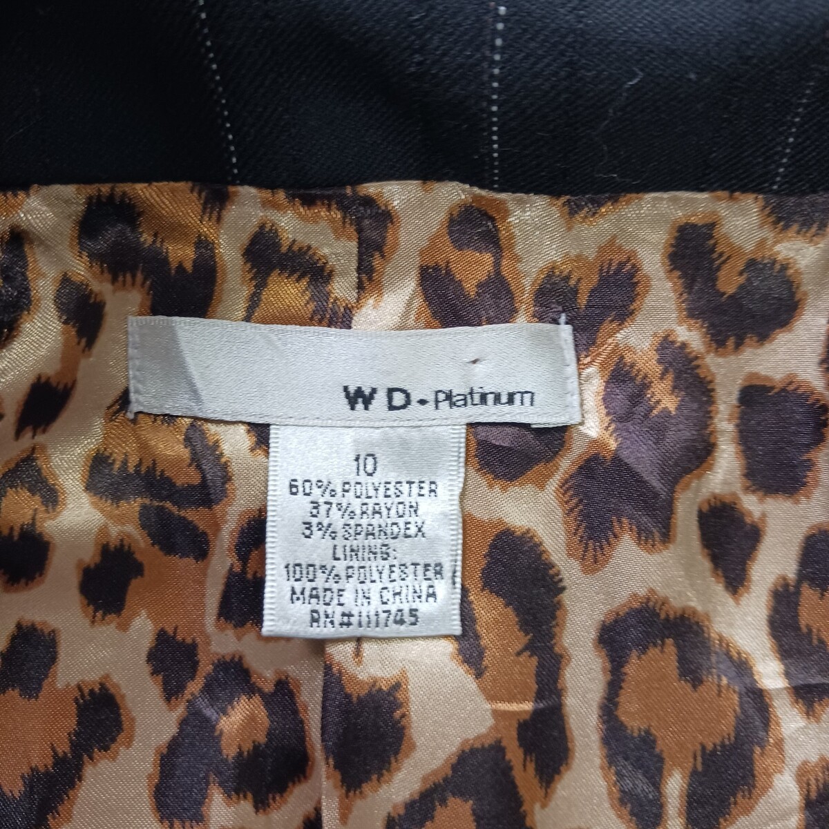 The WD Platinum RN#111745 Women's Black Striped Blazer in size 10 is a stylish and versatile piece perfect for workwear or business attire. Made from a blend of polyester, spandex, and rayon, this blazer features a classic striped pattern, long sleeves, and a 23-inch jacket length. The black color and 100% polyester lining add a touch of sophistication, while the regular fit ensures comfort and a flattering silhouette. Hand wash only to maintain the quality of this chic and timeless blazer from WD Platinum.