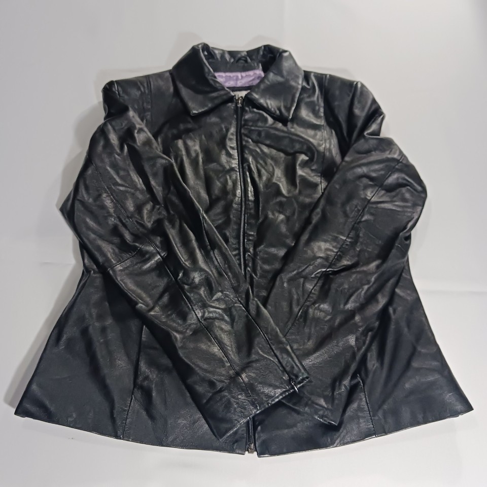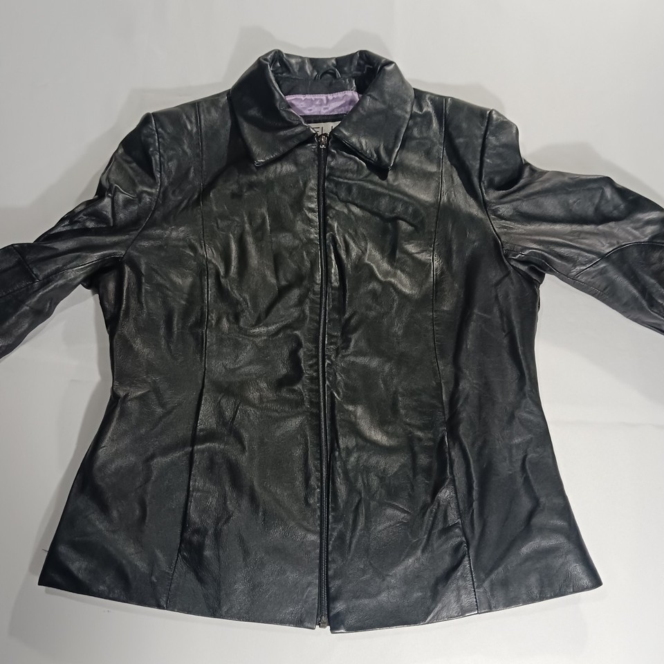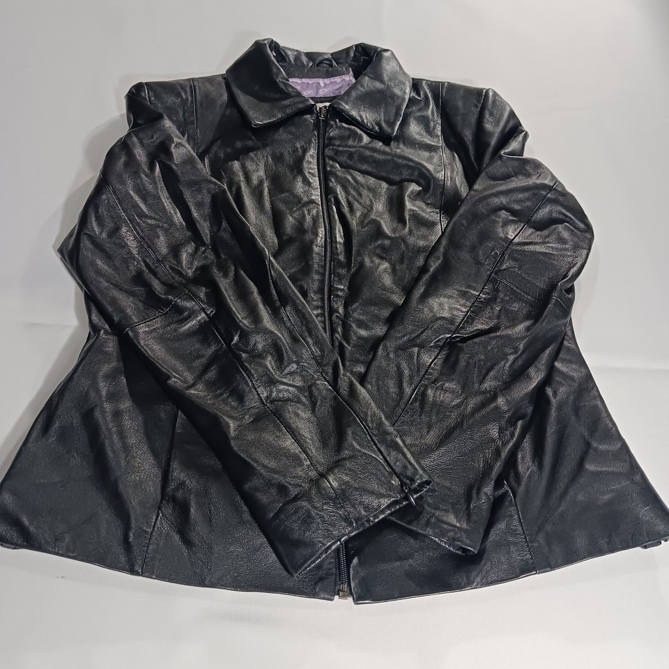 The product is a Wilson's Leather Pelle Studio RN#69426 black men's jacket in size large. This full-zip jacket features a solid black color with a leather outer shell, measuring 25 inches in length and 41 inches in chest size. Made by Wilsons Leather, this coat is designed for men with a regular fit, making it a stylish and quality addition to any wardrobe. The classic jacket style and full-zip closure make it a versatile piece for everyday wear or special occasions.
