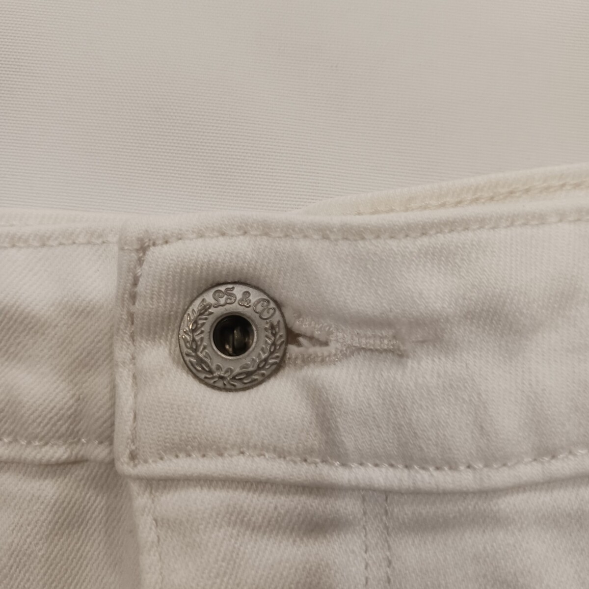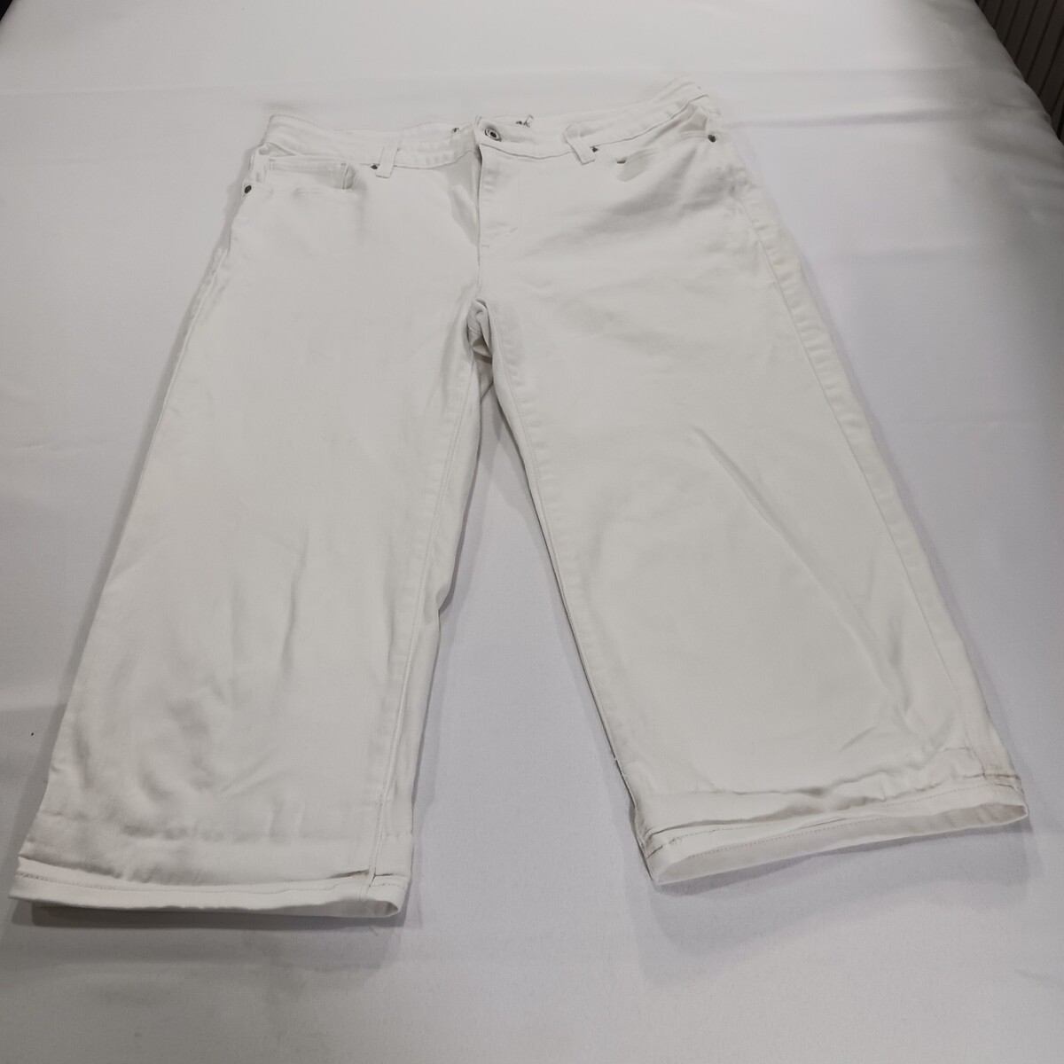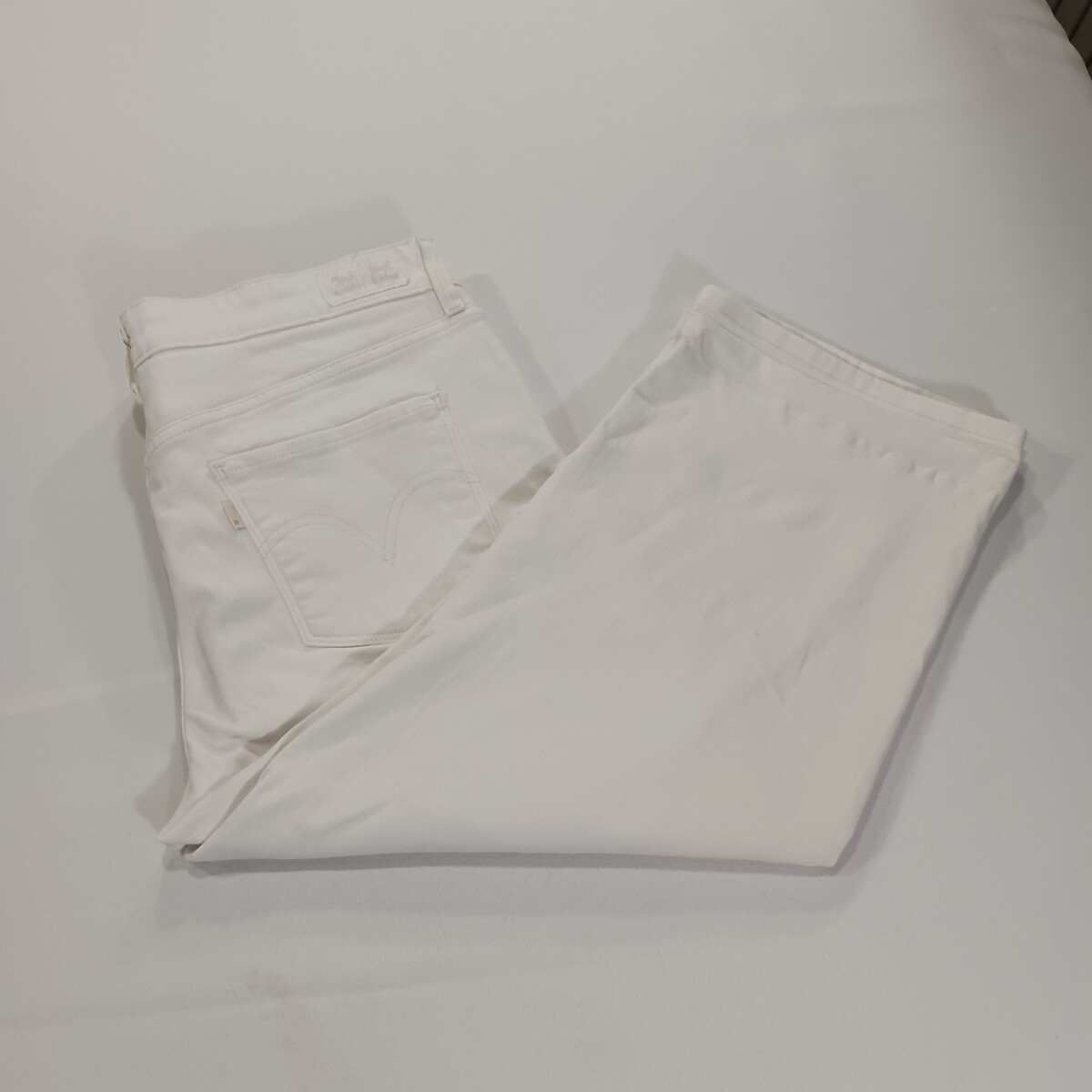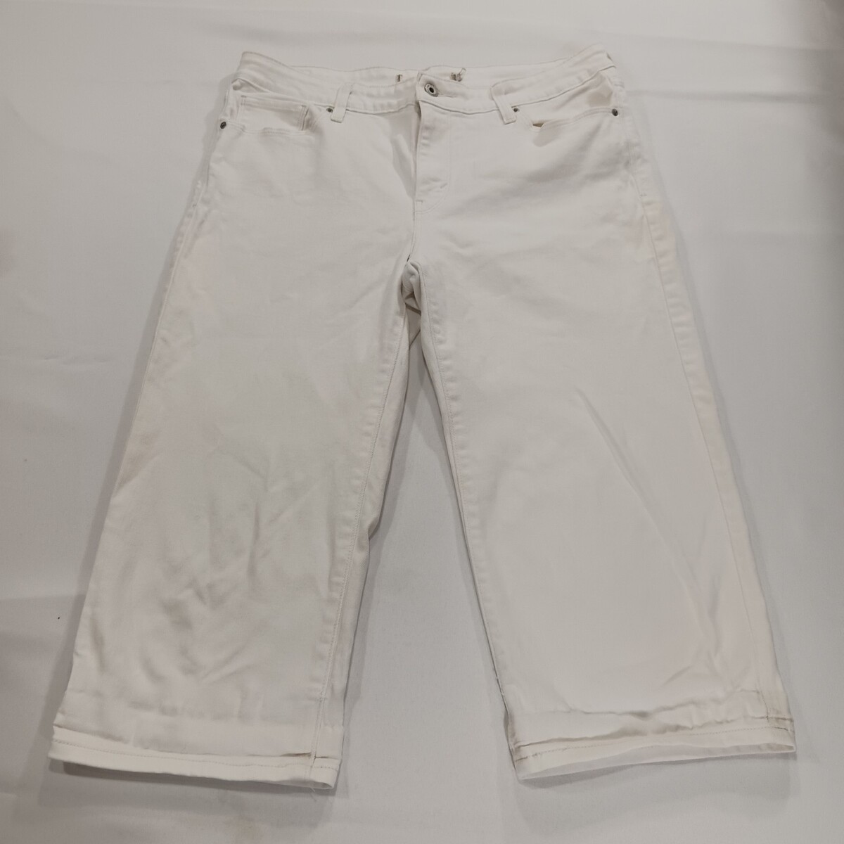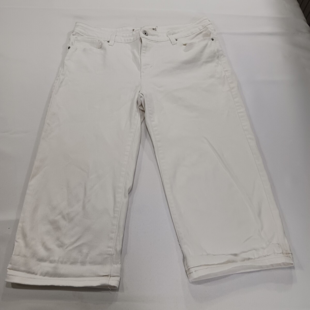 This product is a pair of women's white denim mid-rise cropped jeans in a measured size of 32×20. The jeans feature a zip and button closure, a 5-pocket design, and are made of a blend of spandex and cotton for comfort and stretch. The jeans are designed with a regular fit and a dark wash, making them perfect for year-round wear in all seasons. With a focus on the logo accents, these jeans are stylish and versatile for everyday wear.