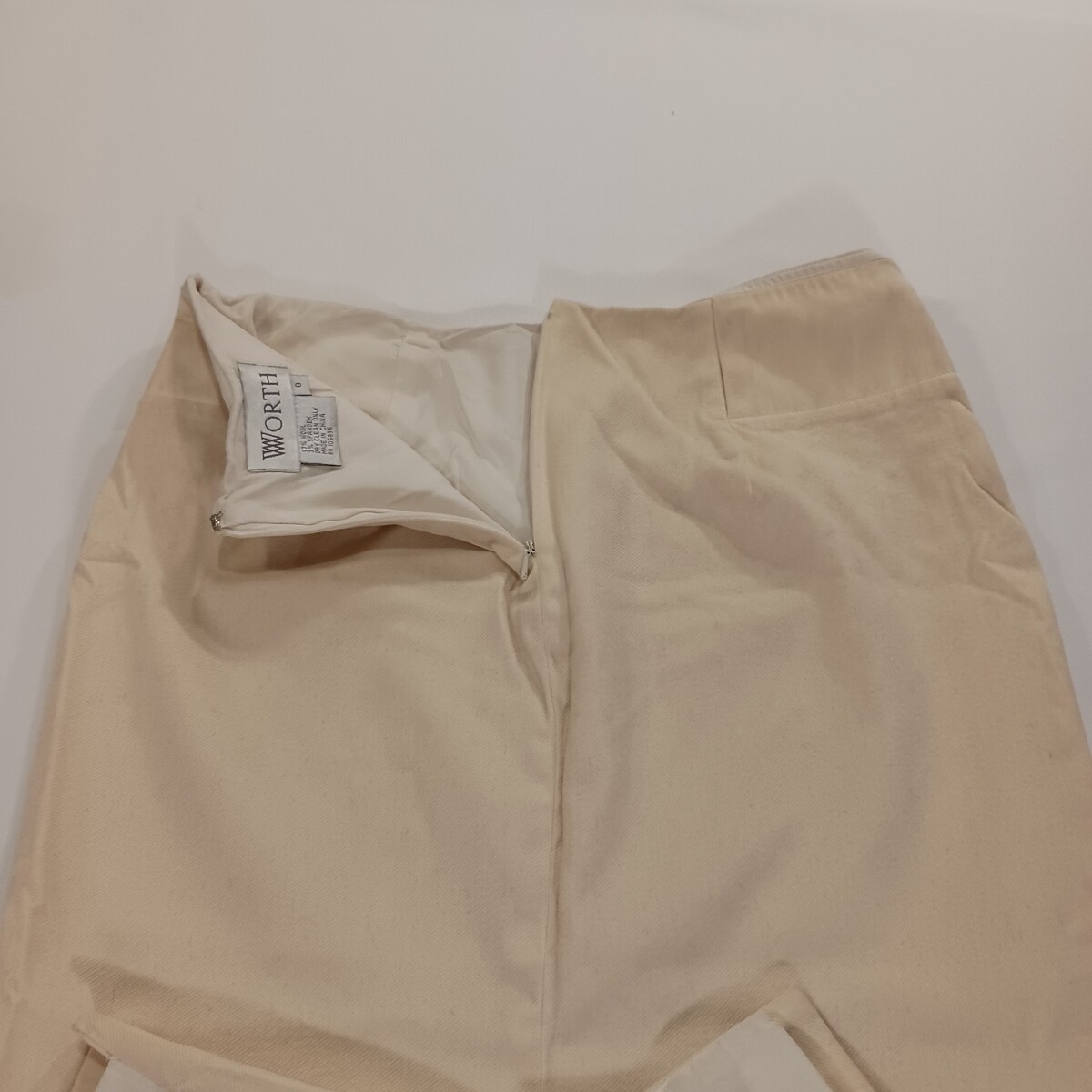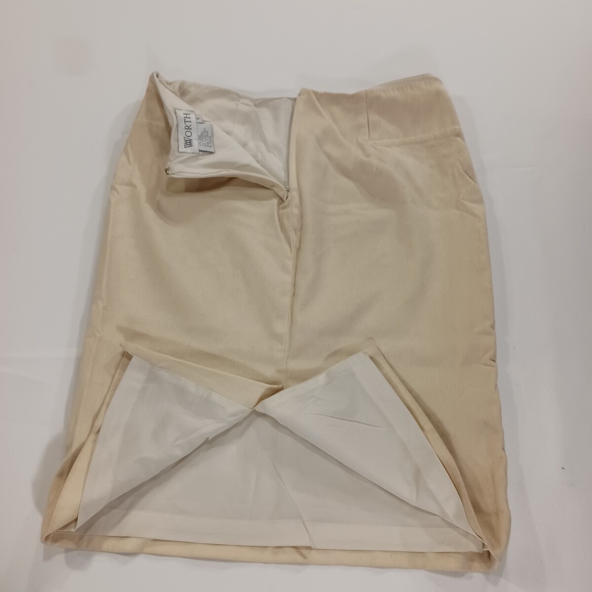 The Worth RN#105896 Women's Cream Wool Blend Rear Zipper & Slit Pencil Skirt in Size 6 is a stylish and versatile piece suitable for various occasions. Made from a blend of spandex and wool, this knit skirt features a striped pattern, rear zipper closure, and a slit detail for added flair. With a mid-rise and straight & pencil style, this skirt is both lined and stretchy, providing comfort and a flattering fit. Perfect for the modern woman looking for a sophisticated yet practical wardrobe staple.