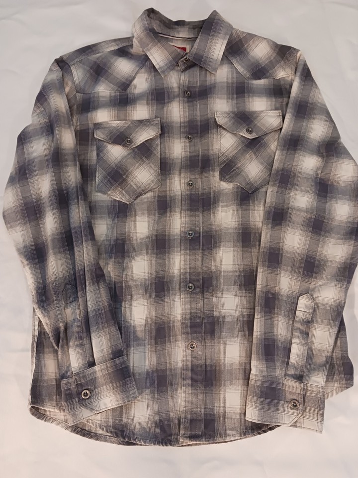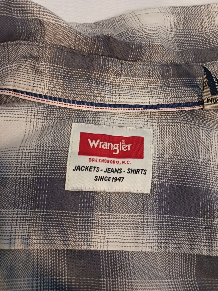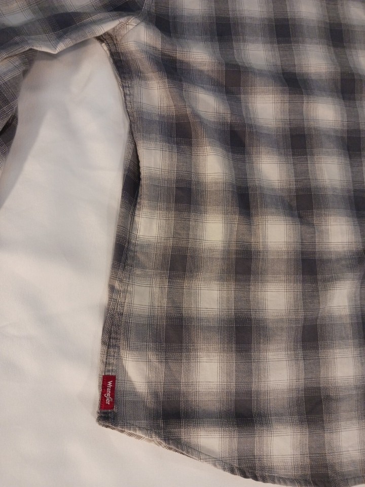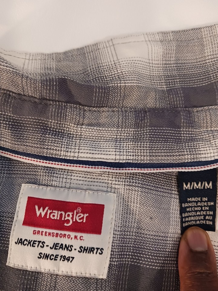 This Wrangler shirt in size medium features a gray plaid pattern with long sleeves and a collared neckline. The closure is snap and the material is a cotton blend. The shirt has accents of buttons and a collar style of point. It is an easy care, lightweight option for all seasons. This shirt is perfect for any casual occasion and is machine washable.
