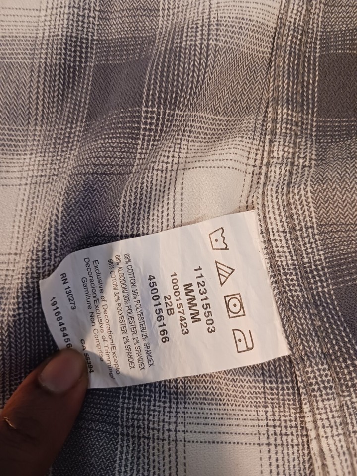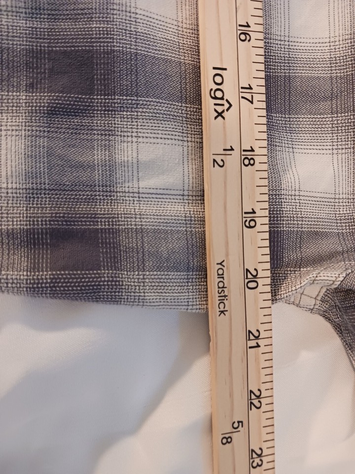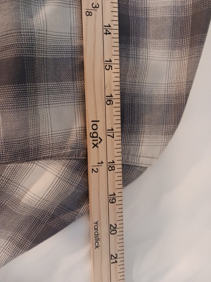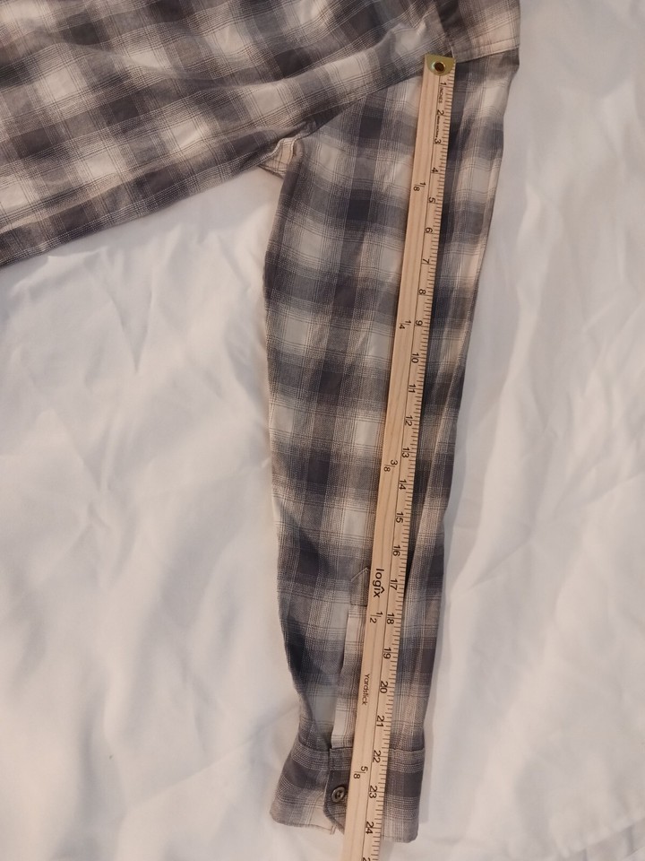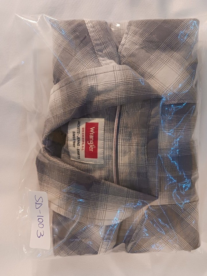 This Wrangler shirt in size medium features a gray plaid pattern with long sleeves and a collared neckline. The closure is snap and the material is a cotton blend. The shirt has accents of buttons and a collar style of point. It is an easy care, lightweight option for all seasons. This shirt is perfect for any casual occasion and is machine washable.